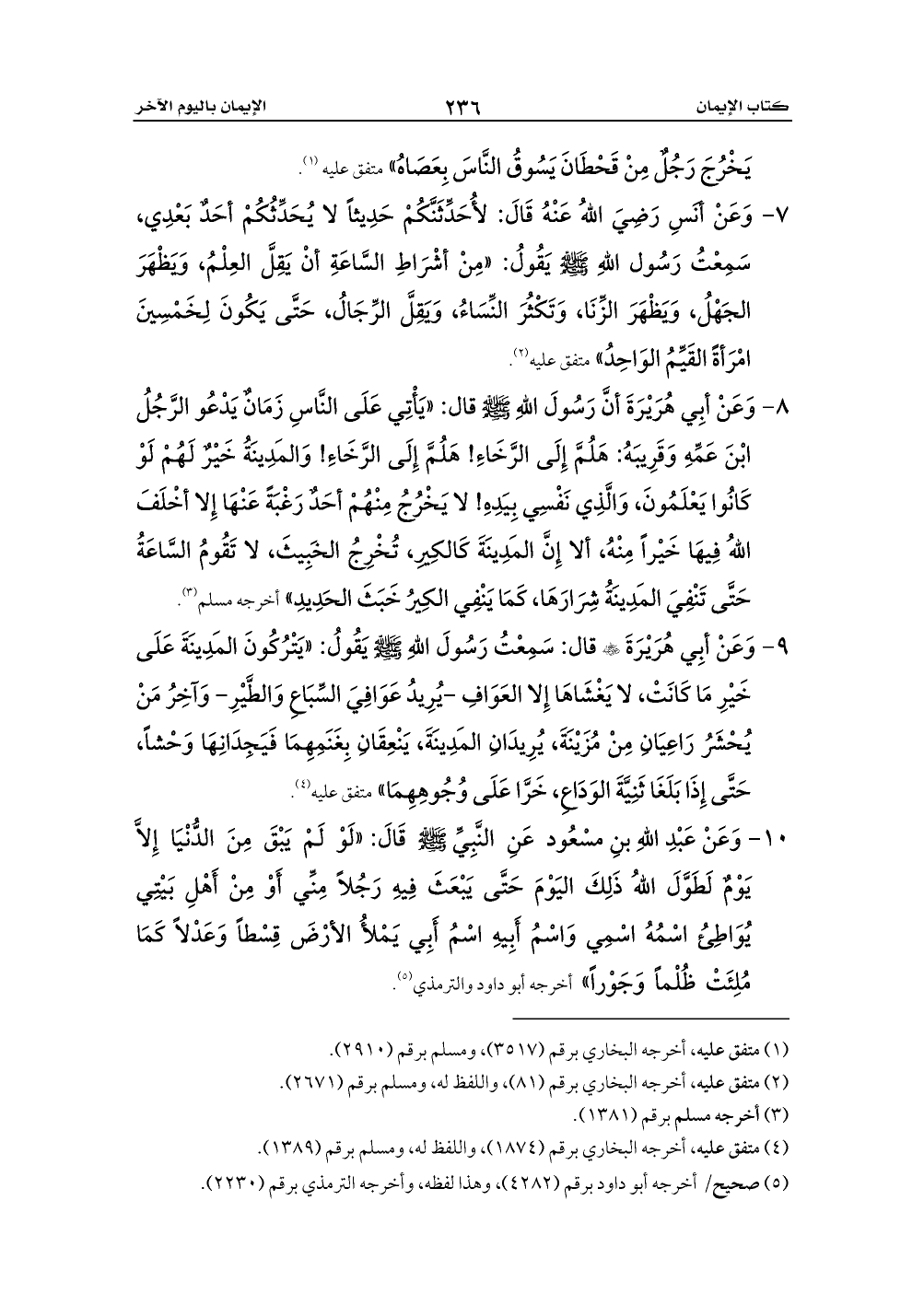 7 - وَعَنْ أنَسِ رَضِيَ اللهُ عَنْهُ قَالَ: لأُحَدِّثَنَّكُمْ حَدِيثاً لا يُحَدِّثُكُمْ أحَدٌ بَعْدِي، سَمِعْتُ رَسُول اللهِ - صلى الله عليه وسلم - يَقُولُ: «مِنْ أشْرَاطِ السَّاعَةِ أنْ يَقِلَّ العِلْمُ، وَيَظْهَرَ الجَهْلُ، وَيَظْهَرَ الزِّنَا، وَتَكْثُرَ النِّسَاءُ، وَيَقِلَّ الرِّجَالُ، حَتَّى يَكُونَ لِخَمْسِينَ امْرَأةً القَيِّمُ الوَاحِدُ» متفق عليه (¬2).