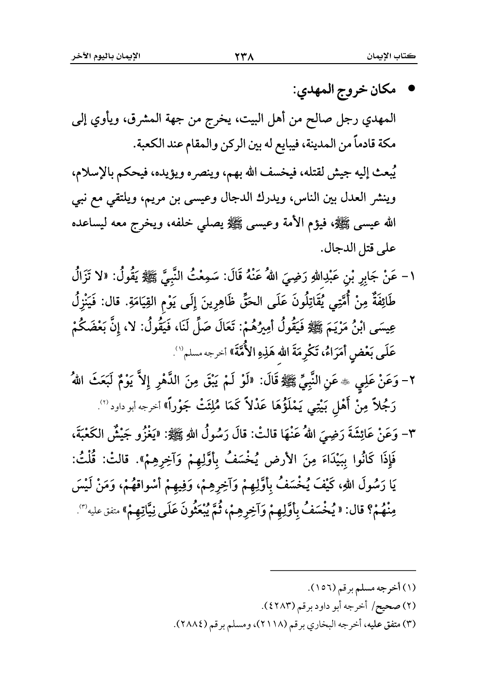 1 - عَنْ جَابِرِ بْنِ عَبْدِاللهِ رَضِيَ اللهُ عَنْهُ قَالَ: سَمِعْتُ النَّبِيَّ - صلى الله عليه وسلم - يَقُولُ: «لا تَزَالُ طَائِفَةٌ مِنْ أُمَّتِي يُقَاتِلُونَ عَلَى الحَقِّ ظَاهِرِينَ إِلَى يَوْمِ القِيَامَةِ. قال: فَيَنْزِلُ عِيسَى ابْنُ مَرْيَمَ - صلى الله عليه وسلم - فَيَقُولُ أمِيرُهُمْ: تَعَالَ صَلِّ لَنَا، فَيَقُولُ: لا، إِنَّ بَعْضَكُمْ عَلَى بَعْضٍ أمَرَاءُ، تَكْرِمَةَ اللهِ هَذِهِ الأُمَّةَ» أخرجه مسلم (¬1).