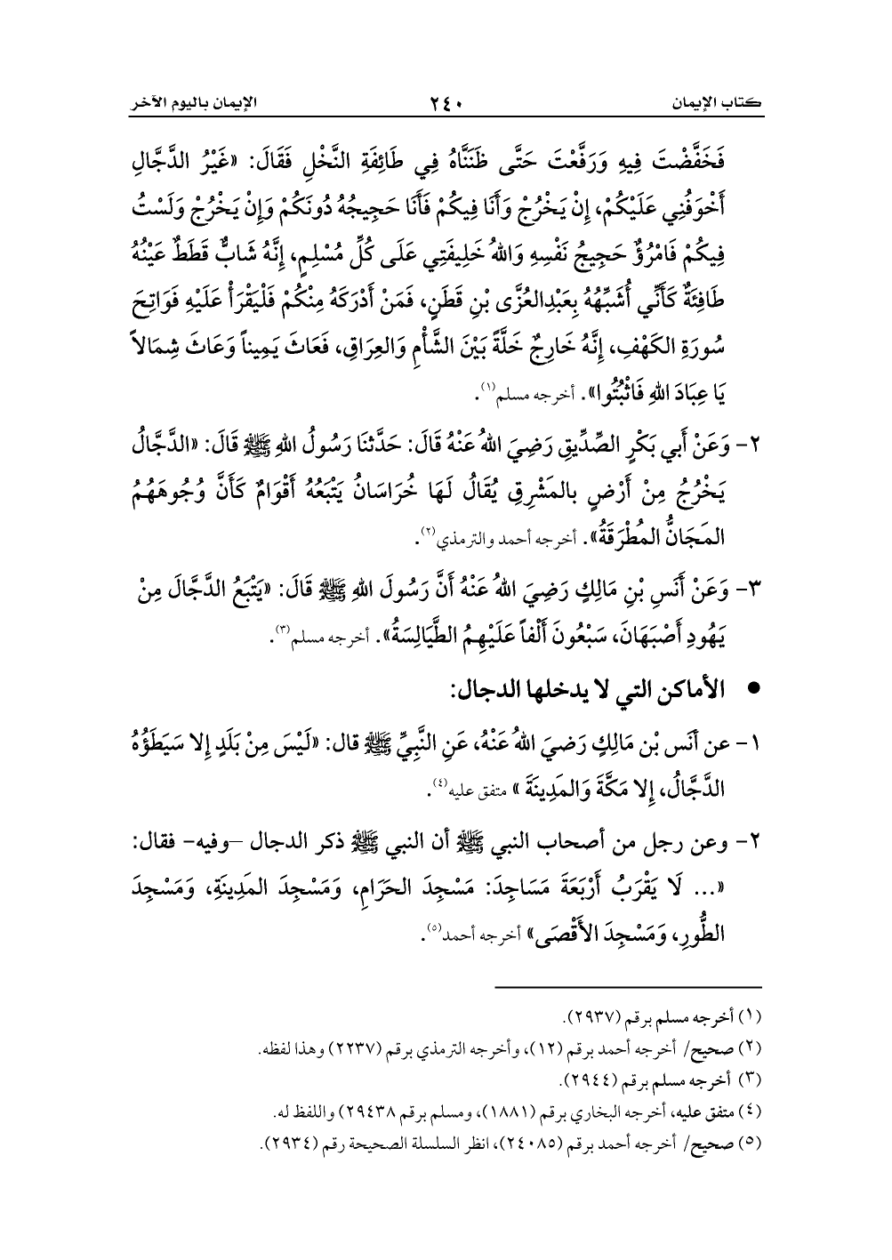 فَخَفَّضْتَ فِيهِ وَرَفَّعْتَ حَتَّى ظَنَنَّاهُ فِي طَائِفَةِ النَّخْلِ فَقَالَ: «غَيْرُ الدَّجَّالِ أَخْوَفُنِي عَلَيْكُمْ، إِنْ يَخْرُجْ وَأَنَا فِيكُمْ فَأَنَا حَجِيجُهُ دُونَكُمْ وَإِنْ يَخْرُجْ وَلَسْتُ فِيكُمْ فَامْرُؤٌ حَجِيجُ نَفْسِهِ وَاللهُ خَلِيفَتِي عَلَى كُلِّ مُسْلِمٍ، إِنَّهُ شَابٌّ قَطَطٌ عَيْنُهُ طَافِئَةٌ كَأَنِّي أُشَبِّهُهُ بِعَبْدِالعُزَّى بْنِ قَطَنٍ، فَمَنْ أَدْرَكَهُ مِنْكُمْ فَلْيَقْرَأْ عَلَيْهِ فَوَاتِحَ سُورَةِ الكَهْفِ، إِنَّهُ خَارِجٌ خَلَّةً بَيْنَ الشَّأْمِ وَالعِرَاقِ، فَعَاثَ يَمِيناً وَعَاثَ شِمَالاً يَا عِبَادَ اللهِ فَاثْبُتُوا». أخرجه مسلم (¬1).