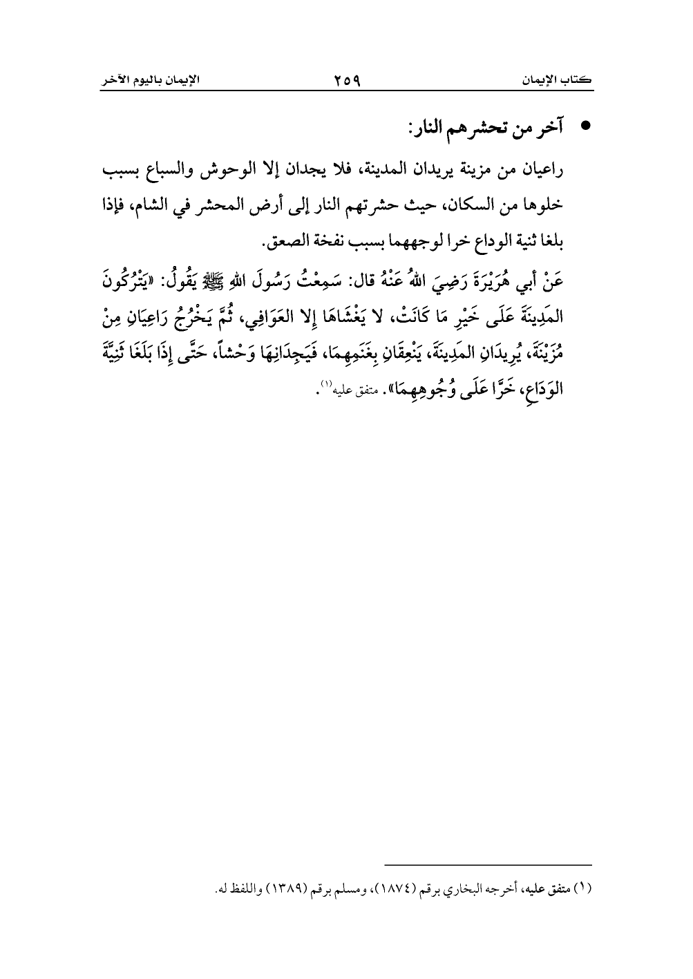 عَنْ أبي هُرَيْرَةَ رَضِيَ اللهُ عَنْهُ قال: سَمِعْتُ رَسُولَ اللهِ - صلى الله عليه وسلم - يَقُولُ: «يَتْرُكُونَ المَدِينَةَ عَلَى خَيْرِ مَا كَانَتْ، لا يَغْشَاهَا إِلا العَوَافِي، ثُمَّ يَخْرُجُ رَاعِيَانِ مِنْ مُزَيْنَةَ، يُرِيدَانِ المَدِينَةَ، يَنْعِقَانِ بِغَنَمِهِمَا، فَيَجِدَانِهَا وَحْشاً، حَتَّى إِذَا بَلَغَا ثَنِيَّةَ الوَدَاعِ، خَرَّا عَلَى وُجُوهِهِمَا». متفق عليه (¬1).