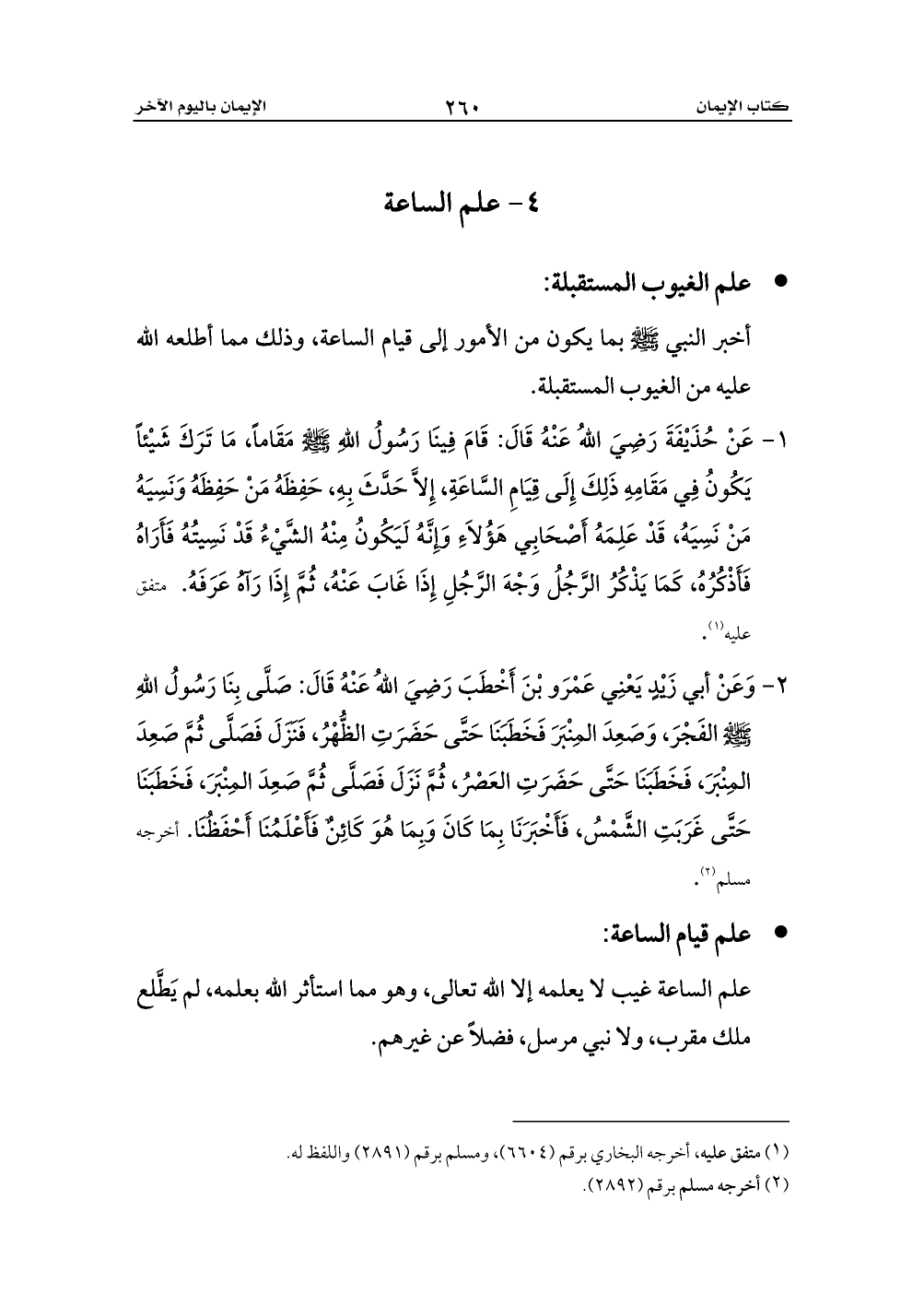1 - عَنْ حُذَيْفَةَ رَضِيَ اللهُ عَنْهُ قَالَ: قَامَ فِينَا رَسُولُ اللهِ - صلى الله عليه وسلم - مَقَاماً، مَا تَرَكَ شَيْئاً يَكُونُ فِي مَقَامِهِ ذَلِكَ إِلَى قِيَامِ السَّاعَةِ، إِلاَّ حَدَّثَ بِهِ، حَفِظَهُ مَنْ حَفِظَهُ وَنَسِيَهُ مَنْ نَسِيَهُ، قَدْ عَلِمَهُ أَصْحَابِي هَؤُلاَءِ وَإِنَّهُ لَيَكُونُ مِنْهُ الشَّيْءُ قَدْ نَسِيتُهُ فَأَرَاهُ فَأَذْكُرُهُ، كَمَا يَذْكُرُ الرَّجُلُ وَجْهَ الرَّجُلِ إِذَا غَابَ عَنْهُ، ثُمَّ إِذَا رَآهُ عَرَفَهُ. متفق عليه (¬1).