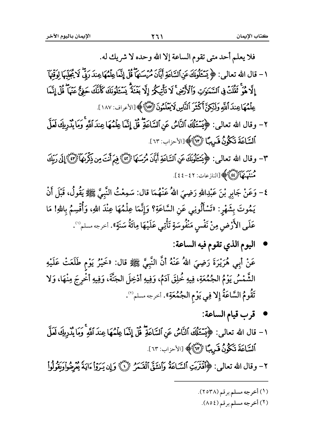 1 - قال الله تعالى: {يَسْأَلُونَكَ عَنِ السَّاعَةِ أَيَّانَ مُرْسَاهَا قُلْ إِنَّمَا عِلْمُهَا عِنْدَ رَبِّي لَا يُجَلِّيهَا لِوَقْتِهَا إِلَّا هُوَ ثَقُلَتْ فِي السَّمَاوَاتِ وَالْأَرْضِ لَا تَأْتِيكُمْ إِلَّا بَغْتَةً يَسْأَلُونَكَ كَأَنَّكَ حَفِيٌّ عَنْهَا قُلْ إِنَّمَا عِلْمُهَا عِنْدَ اللَّهِ وَلَكِنَّ أَكْثَرَ النَّاسِ لَا يَعْلَمُونَ (187)} [الأعراف: 187].