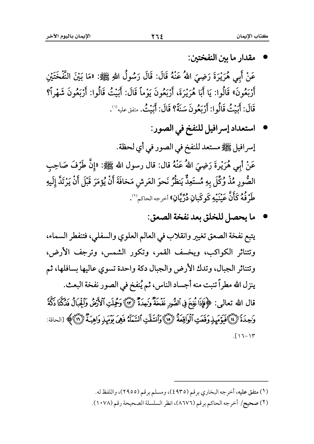 عَنْ أَبِي هُرَيْرَةَ رَضِيَ اللهُ عَنْهُ قَالَ: قَالَ رَسُولُ اللهِ - صلى الله عليه وسلم -: «مَا بَيْنَ النَّفْخَتَيْنِ أَرْبَعُونَ» قَالُوا: يَا أَبَا هُرَيْرَةَ، أَرْبَعُونَ يَوْماً قَالَ: أَبَيْتُ قَالُوا: أَرْبَعُونَ شَهْراً؟ قَالَ: أَبَيْتُ قَالُوا: أَرْبَعُونَ سَنَةً؟ قَالَ: أَبَيْتُ. متفق عليه (¬1).