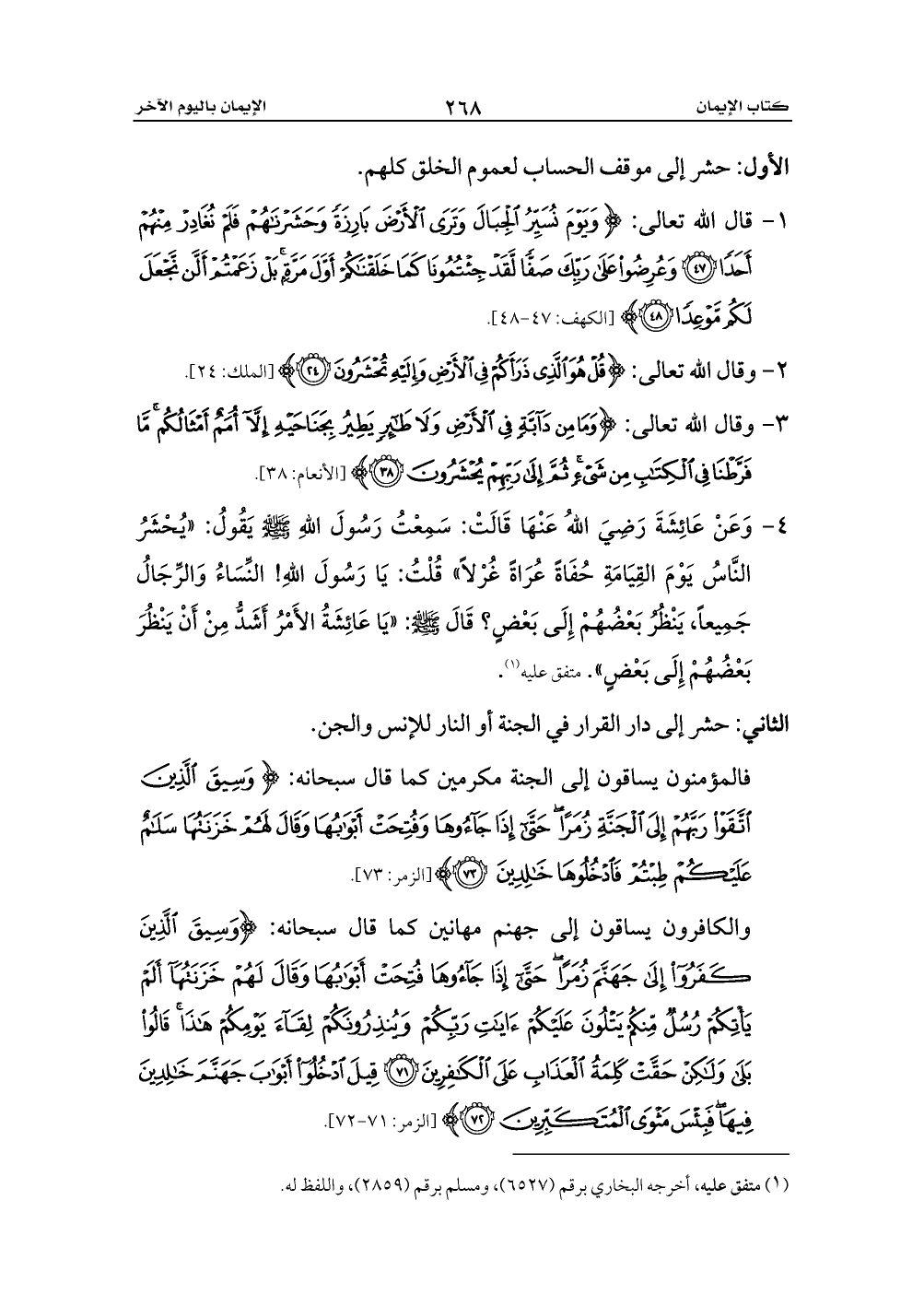 1 - قال الله تعالى: {وَيَوْمَ نُسَيِّرُ الْجِبَالَ وَتَرَى الْأَرْضَ بَارِزَةً وَحَشَرْنَاهُمْ فَلَمْ نُغَادِرْ مِنْهُمْ أَحَدًا (47) وَعُرِضُوا عَلَى رَبِّكَ صَفًّا لَقَدْ جِئْتُمُونَا كَمَا خَلَقْنَاكُمْ أَوَّلَ مَرَّةٍ بَلْ زَعَمْتُمْ أَلَّنْ نَجْعَلَ لَكُمْ مَوْعِدًا (48)} [الكهف: 47 - 48].