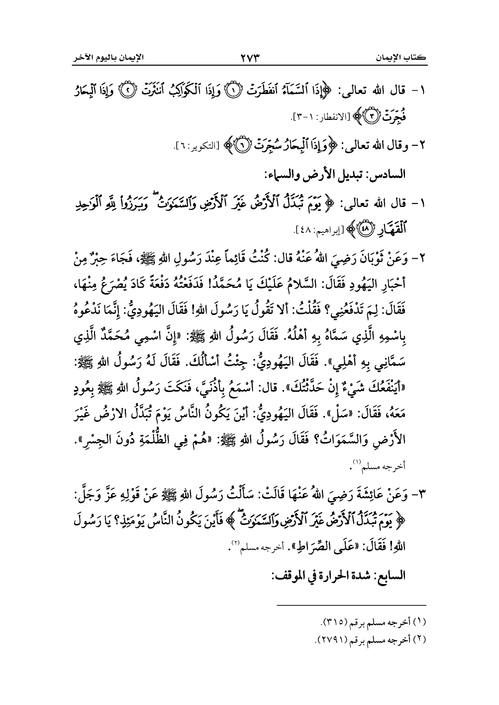 2 - وَعَنْ ثَوْبَانَ رَضِيَ اللهُ عَنْهُ قال: كُنْتُ قَائِماً عِنْدَ رَسُولِ اللهِ - صلى الله عليه وسلم -، فَجَاءَ حِبْرٌ مِنْ أحْبَارِ اليَهُودِ فَقَالَ: السَّلامُ عَلَيْكَ يَا مُحَمَّدُ! فَدَفَعْتُهُ دَفْعَةً كَادَ يُصْرَعُ مِنْهَا، فَقَالَ: لِمَ تَدْفَعُنِي؟ فَقُلْتُ: ألا تَقُولُ يَا رَسُولَ اللهِ! فَقَالَ اليَهُودِيُّ: إِنَّمَا نَدْعُوهُ بِاسْمِهِ الَّذِي سَمَّاهُ بِهِ أهْلُهُ. فَقَالَ رَسُولُ اللهِ - صلى الله عليه وسلم -: «إِنَّ اسْمِي مُحَمَّدٌ الَّذِي سَمَّانِي بِهِ أهْلِي». فَقَالَ اليَهُودِيُّ: جِئْتُ أسْألُكَ. فَقَالَ لَهُ رَسُولُ اللهِ - صلى الله عليه وسلم -: «أيَنْفَعُكَ شَيْءٌ إِنْ حَدَّثْتُكَ». قال: أسْمَعُ بِأذُنَيَّ، فَنَكَتَ رَسُولُ اللهِ - صلى الله عليه وسلم - بِعُودٍ مَعَهُ، فَقَالَ: «سَلْ». فَقَالَ اليَهُودِيُّ: أيْنَ يَكُونُ النَّاسُ يَوْمَ تُبَدَّلُ الارْضُ غَيْرَ الأَرْضِ وَالسَّمَوَاتُ؟ فَقَالَ رَسُولُ اللهِ - صلى الله عليه وسلم -: «هُمْ فِي الظُّلْمَةِ دُونَ الجِسْرِ».