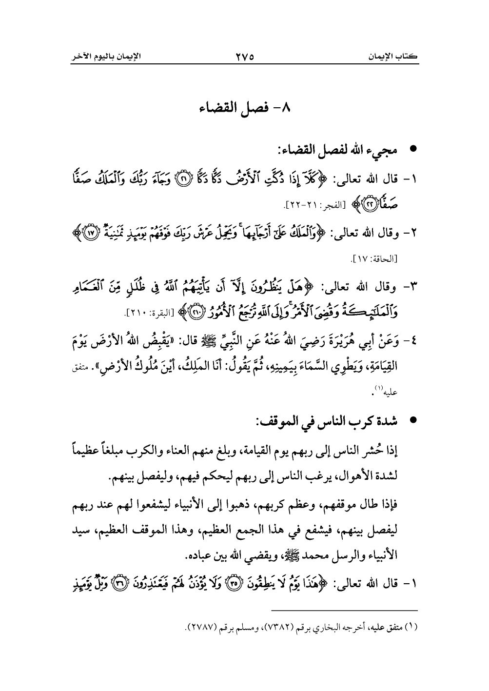 1 - قال الله تعالى: {كَلَّا إِذَا دُكَّتِ الْأَرْضُ دَكًّا دَكًّا (21) وَجَاءَ رَبُّكَ وَالْمَلَكُ صَفًّا صَفًّا} [الفجر: 21 - 22].