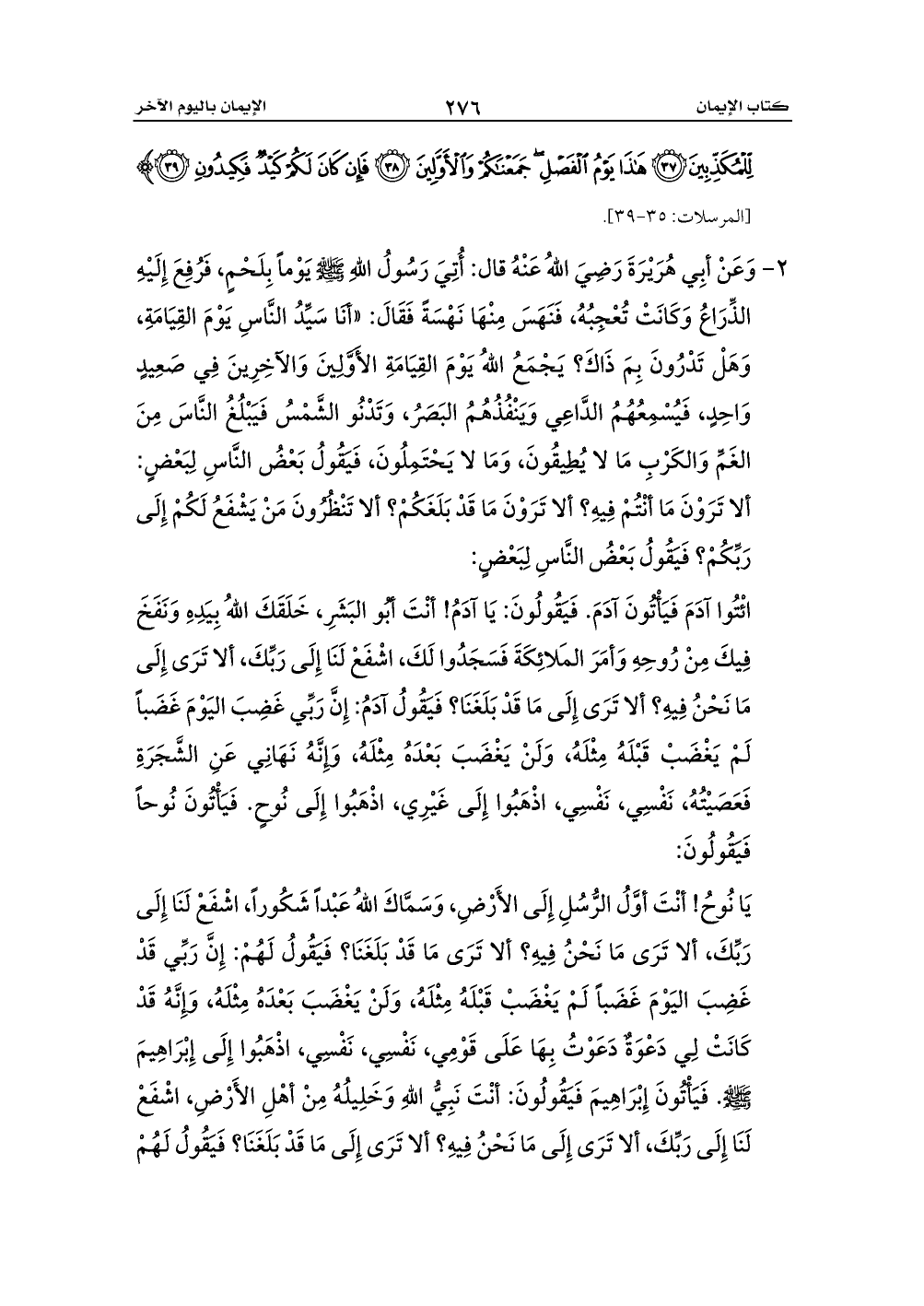 2 - وَعَنْ أبِي هُرَيْرَةَ رَضِيَ اللهُ عَنْهُ قال: أُتِيَ رَسُولُ اللهِ - صلى الله عليه وسلم - يَوْماً بِلَحْمٍ، فَرُفِعَ إِلَيْهِ الذِّرَاعُ وَكَانَتْ تُعْجِبُهُ، فَنَهَسَ مِنْهَا نَهْسَةً فَقَالَ: «أنَا سَيِّدُ النَّاسِ يَوْمَ القِيَامَةِ، وَهَلْ تَدْرُونَ بِمَ ذَاكَ؟ يَجْمَعُ اللهُ يَوْمَ القِيَامَةِ الأَوَّلِينَ وَالآخِرِينَ فِي صَعِيدٍ وَاحِدٍ، فَيُسْمِعُهُمُ الدَّاعِي وَيَنْفُذُهُمُ البَصَرُ، وَتَدْنُو الشَّمْسُ فَيَبْلُغُ النَّاسَ مِنَ الغَمِّ وَالكَرْبِ مَا لا يُطِيقُونَ، وَمَا لا يَحْتَمِلُونَ، فَيَقُولُ بَعْضُ النَّاسِ لِبَعْضٍ: ألا تَرَوْنَ مَا أنْتُمْ فِيهِ؟ ألا تَرَوْنَ مَا قَدْ بَلَغَكُمْ؟ ألا تَنْظُرُونَ مَنْ يَشْفَعُ لَكُمْ إِلَى رَبِّكُمْ؟ فَيَقُولُ بَعْضُ النَّاسِ لِبَعْضٍ: