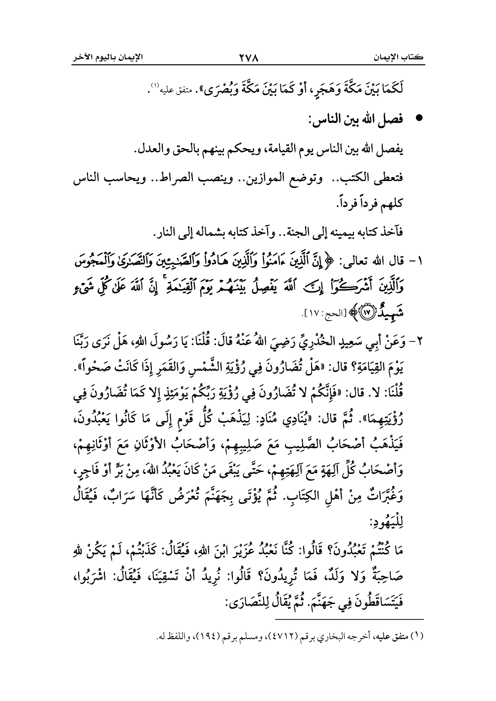 2 - وَعَنْ أبِي سَعِيدٍ الخُدْرِيِّ رَضِيَ اللهُ عَنْهُ قالَ: قُلْنَا: يَا رَسُولَ اللهِ، هَلْ نَرَى رَبَّنَا يَوْمَ القِيَامَةِ؟ قال: «هَلْ تُضَارُونَ فِي رُؤْيَةِ الشَّمْسِ وَالقَمَرِ إِذَا كَانَتْ صَحْواً». قُلْنَا: لا. قال: «فَإِنَّكُمْ لا تُضَارُونَ فِي رُؤْيَةِ رَبِّكُمْ يَوْمَئِذٍ إِلا كَمَا تُضَارُونَ فِي رُؤْيَتِهِمَا». ثُمَّ قال: «يُنَادِي مُنَادٍ: لِيَذْهَبْ كُلُّ قَوْمٍ إِلَى مَا كَانُوا يَعْبُدُونَ،