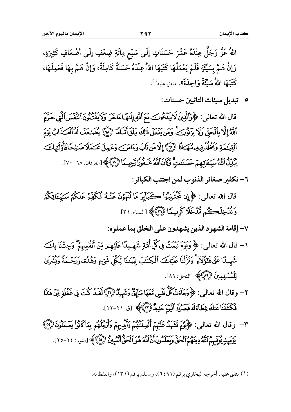 1 - قال الله تعالى: {وَيَوْمَ نَبْعَثُ فِي كُلِّ أُمَّةٍ شَهِيدًا عَلَيْهِمْ مِنْ أَنْفُسِهِمْ وَجِئْنَا بِكَ شَهِيدًا عَلَى هَؤُلَاءِ وَنَزَّلْنَا عَلَيْكَ الْكِتَابَ تِبْيَانًا لِكُلِّ شَيْءٍ وَهُدًى وَرَحْمَةً وَبُشْرَى لِلْمُسْلِمِينَ (89)} [النحل: 89].