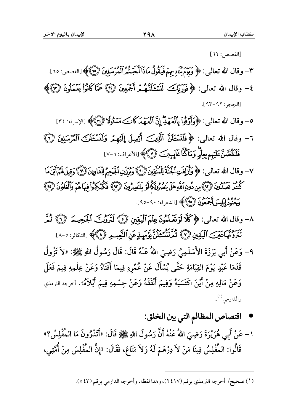 4 - وقال الله تعالى: {فَوَرَبِّكَ لَنَسْأَلَنَّهُمْ أَجْمَعِينَ (92) عَمَّا كَانُوا يَعْمَلُونَ (93)} [الحِجر: 92 - 93].