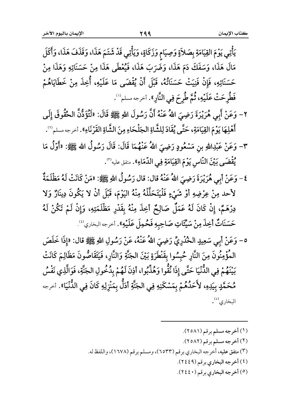 5 - وَعَنْ أبِي سَعِيدٍ الخُدْرِيِّ رَضِيَ اللهُ عَنْهُ، عَنْ رَسُولِ اللهِ - صلى الله عليه وسلم - قال: «إِذَا خَلَصَ المُؤْمِنُونَ مِنَ النَّارِ حُبِسُوا بِقَنْطَرَةٍ بَيْنَ الجَنَّةِ وَالنَّارِ، فَيَتَقَاصُّونَ مَظَالِمَ كَانَتْ بَيْنَهُمْ فِي الدُّنْيَا حَتَّى إِذَا نُقُّوا وَهُذِّبُوا، أذِنَ لَهُمْ بِدُخُولِ الجَنَّةِ، فَوَالَّذِي نَفْسُ مُحَمَّدٍ بِيَدِهِ، لأَحَدُهُمْ بِمَسْكَنِهِ فِي الجَنَّةِ أدَلُّ بِمَنْزِلِهِ كَانَ فِي الدُّنْيَا». أخرجه البخاري (¬5).