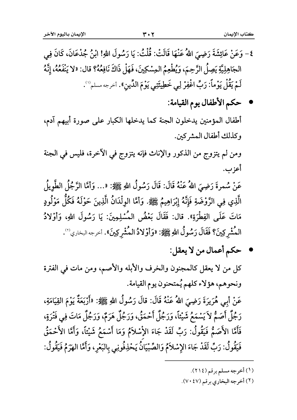 عَنْ أبِي هُرَيرَةَ رَضِيَ اللهُ عَنْهُ قَالَ: قالَ رَسُولُ اللهِ - صلى الله عليه وسلم -: «أَرْبَعَةٌ يَوْمَ القِيَامَةِ، رَجُلٌ أَصَمُّ لاَ يَسْمَعُ شَيْئاً، وَرَجُلٌ أَحْمَقُ، وَرَجُلٌ هَرَمٌ، وَرَجُلٌ مَاتَ فِي فَتْرَةٍ، فَأَمَّا الأَصَمُّ فَيَقُولُ: رَبِّ لَقَدْ جَاءَ الإِْسْلاَمُ وَمَا أَسْمَعُ شَيْئاً، وَأَمَّا الأَحْمَقُ فَيَقُولُ: رَبِّ لَقَدْ جَاءَ الإِسْلاَمُ وَالصِّبْيَانُ يَحْذِفُونِي بِالبَعْرِ، وَأَمَّا الهَرَمُ فَيَقُولُ: