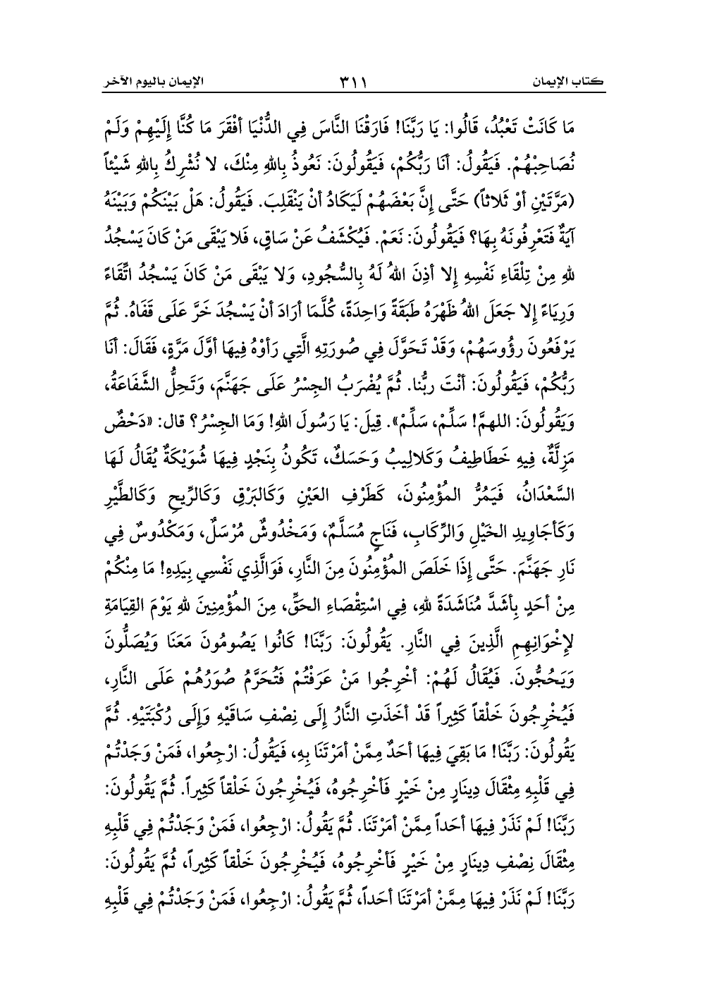 السَّعْدَانُ، فَيَمُرُّ المُؤْمِنُونَ، كَطَرْفِ العَيْنِ وَكَالبَرْقِ وَكَالرِّيحِ وَكَالطَّيْرِ وَكَأجَاوِيدِ الخَيْلِ وَالرِّكَابِ، فَنَاجٍ مُسَلَّمٌ، وَمَخْدُوشٌ مُرْسَلٌ، وَمَكْدُوسٌ فِي نَارِ جَهَنَّمَ. حَتَّى إِذَا خَلَصَ المُؤْمِنُونَ مِنَ النَّارِ، فَوَالَّذِي نَفْسِي بِيَدِهِ! مَا مِنْكُمْ مِنْ أحَدٍ بِأشَدَّ مُنَاشَدَةً للهِ، فِي اسْتِقْصَاءِ الحَقِّ، مِنَ المُؤْمِنِينَ للهِ يَوْمَ القِيَامَةِ لإِخْوَانِهِمِ الَّذِينَ فِي النَّارِ. يَقُولُونَ: رَبَّنَا! كَانُوا يَصُومُونَ مَعَنَا وَيُصَلُّونَ وَيَحُجُّونَ. فَيُقَالُ لَهُمْ: أخْرِجُوا مَنْ عَرَفْتُمْ فَتُحَرَّمُ صُوَرُهُمْ عَلَى النَّارِ، فَيُخْرِجُونَ خَلْقاً كَثِيراً قَدْ أخَذَتِ النَّارُ إِلَى نِصْفِ سَاقَيْهِ وَإِلَى رُكْبَتَيْهِ. ثُمَّ يَقُولُونَ: رَبَّنَا! مَا بَقِيَ فِيهَا أحَدٌ مِمَّنْ أمَرْتَنَا بِهِ، فَيَقُولُ: ارْجِعُوا، فَمَنْ وَجَدْتُمْ فِي قَلْبِهِ مِثْقَالَ دِينَارٍ مِنْ خَيْرٍ فَأخْرِجُوهُ، فَيُخْرِجُونَ خَلْقاً كَثِيراً. ثُمَّ يَقُولُونَ: رَبَّنَا! لَمْ نَذَرْ فِيهَا أحَداً مِمَّنْ أمَرْتَنَا. ثُمَّ يَقُولُ: ارْجِعُوا، فَمَنْ وَجَدْتُمْ فِي قَلْبِهِ مِثْقَالَ نِصْفِ دِينَارٍ مِنْ خَيْرٍ فَأخْرِجُوهُ، فَيُخْرِجُونَ خَلْقاً كَثِيراً، ثُمَّ يَقُولُونَ: رَبَّنَا! لَمْ نَذَرْ فِيهَا مِمَّنْ أمَرْتَنَا أحَداً، ثُمَّ يَقُولُ: ارْجِعُوا، فَمَنْ وَجَدْتُمْ فِي قَلْبِهِ