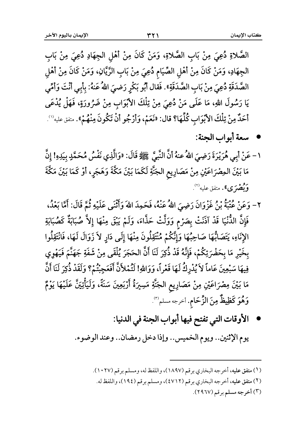 1 - عَنْ أبِي هُرَيْرَةَ رَضِيَ اللهُ عنهُ أنَّ النَّبيَّ - صلى الله عليه وسلم - قَالَ: «وَالَّذِي نَفْسُ مُحَمَّدٍ بِيَدِهِ! إِنَّ مَا بَيْنَ المِصْرَاعَيْنِ مِنْ مَصَارِيعِ الجَنَّةِ لَكَمَا بَيْنَ مَكَّةَ وَهَجَرٍ، أوْ كَمَا بَيْنَ مَكَّةَ وَبُصْرَى». متفق عليه (¬2).