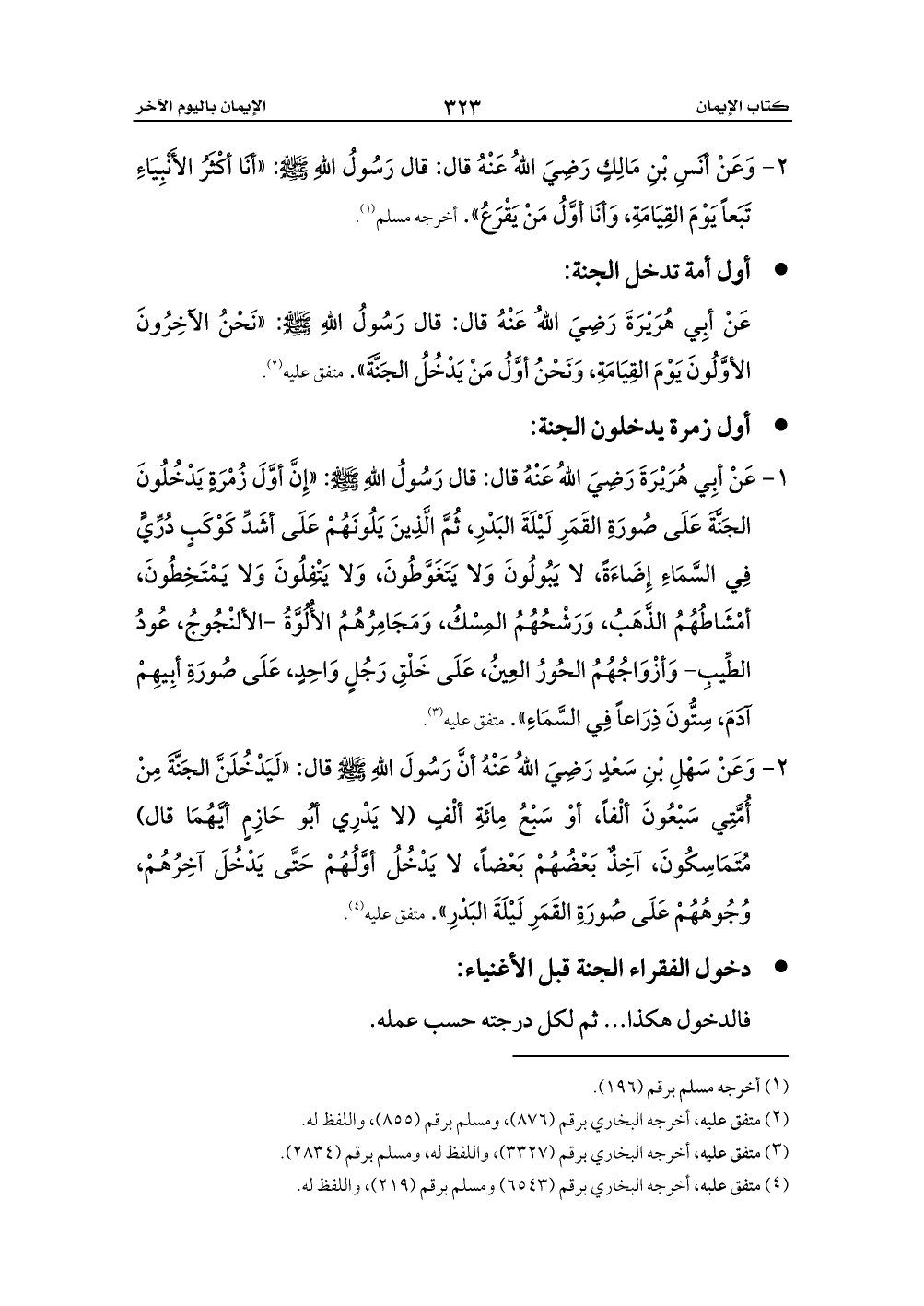 عَنْ أبِي هُرَيْرَةَ رَضِيَ اللهُ عَنْهُ قال: قال رَسُولُ اللهِ - صلى الله عليه وسلم -: «نَحْنُ الآخِرُونَ الأوَّلُونَ يَوْمَ القِيَامَةِ، وَنَحْنُ أوَّلُ مَنْ يَدْخُلُ الجَنَّةَ». متفق عليه (¬2).