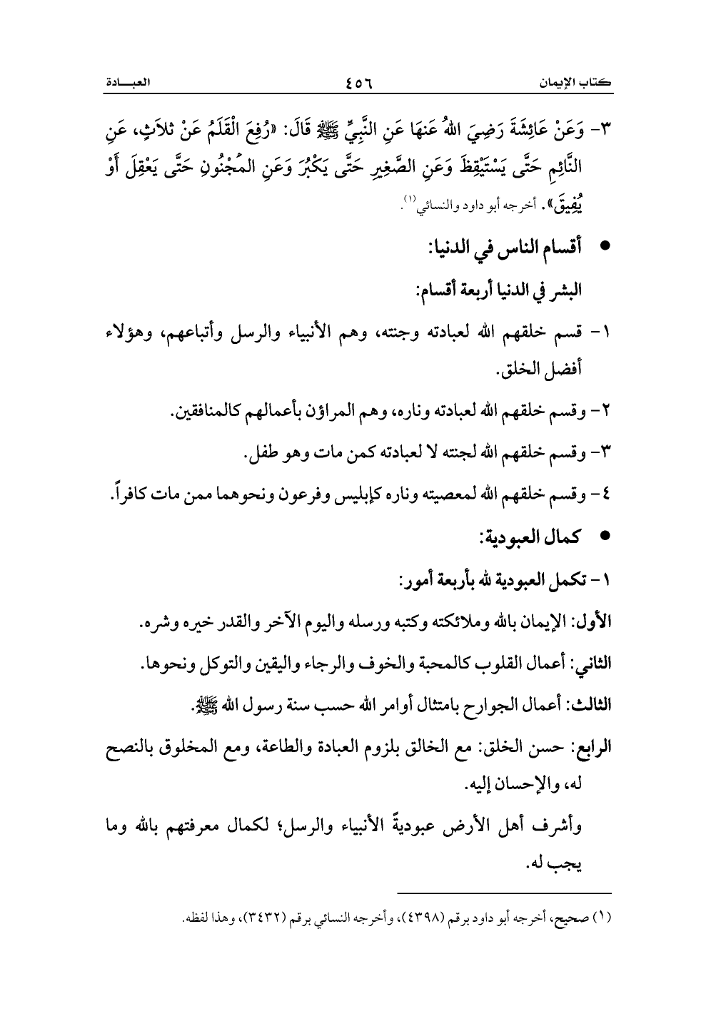 3 - وَعَنْ عَائِشَةَ رَضِيَ اللهُ عَنهَا عَنِ النَّبِيِّ - صلى الله عليه وسلم - قَالَ: «رُفِعَ الْقَلَمُ عَنْ ثلاَثٍ، عَنِ النَّائِمِ حَتَّى يَسْتَيْقِظَ وَعَنِ الصَّغِيرِ حَتَّى يَكْبُرَ وَعَنِ المَجْنُونِ حَتَّى يَعْقِلَ أَوْ يُفِيقَ». أخرجه أبو داود والنسائي (¬1).
