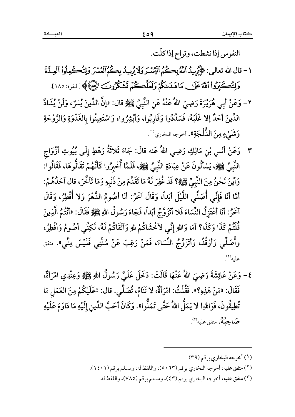 3 - وَعَنْ أنَسِ بْنِ مَالِكٍ رَضِي اللهُ عَنه قالَ: جَاءَ ثَلاثَةُ رَهْطٍ إِلَى بُيُوتِ أزْوَاجِ النَّبِيِّ - صلى الله عليه وسلم -، يَسْألُونَ عَنْ عِبَادَةِ النَّبِيِّ - صلى الله عليه وسلم -، فَلَمَّا أُخْبِرُوا كَأنَّهُمْ تَقَالُّوهَا، فَقَالُوا: وَأيْنَ نَحْنُ مِنَ النَّبِيِّ - صلى الله عليه وسلم -؟ قَدْ غُفِرَ لَهُ مَا تَقَدَّمَ مِنْ ذَنْبِهِ وَمَا تَأخَّرَ، قال أحَدُهُمْ: أمَّا أنَا فَإِنِّي أُصَلِّي اللَّيْلَ أبَداً، وَقَالَ آخَرُ: أنَا أصُومُ الدَّهْرَ وَلا أُفْطِرُ، وَقَالَ آخَرُ: أنَا أعْتَزِلُ النِّسَاءَ فَلا أتَزَوَّجُ أبَداً، فَجَاءَ رَسُولُ اللهِ - صلى الله عليه وسلم - فَقَالَ: «أنْتُمُ الَّذِينَ قُلْتُمْ كَذَا وَكَذَا؟ أمَا وَاللهِ إِنِّي لأخْشَاكُمْ للهِ وَأتْقَاكُمْ لَهُ، لَكِنِّي أصُومُ وَأفْطِرُ، وأُصَلِّي وَأرْقُدُ، وَأتَزَوَّجُ النِّسَاءَ، فَمَنْ رَغِبَ عَنْ سُنَّتِي فَلَيْسَ مِنِّي». متفق عليه (¬2).