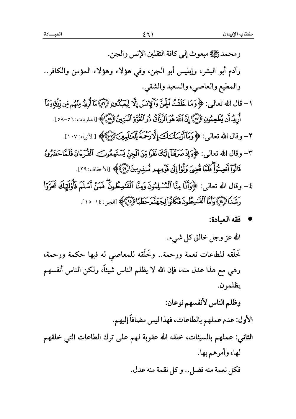 خَلْقه للطاعات نعمة ورحمة .. وخَلْقه للمعاصي له فيها حكمة ورحمة، وهي مع هذا عدل منه، فإن الله لا يظلم الناس شيئاً، ولكن الناس أنفسهم يظلمون.