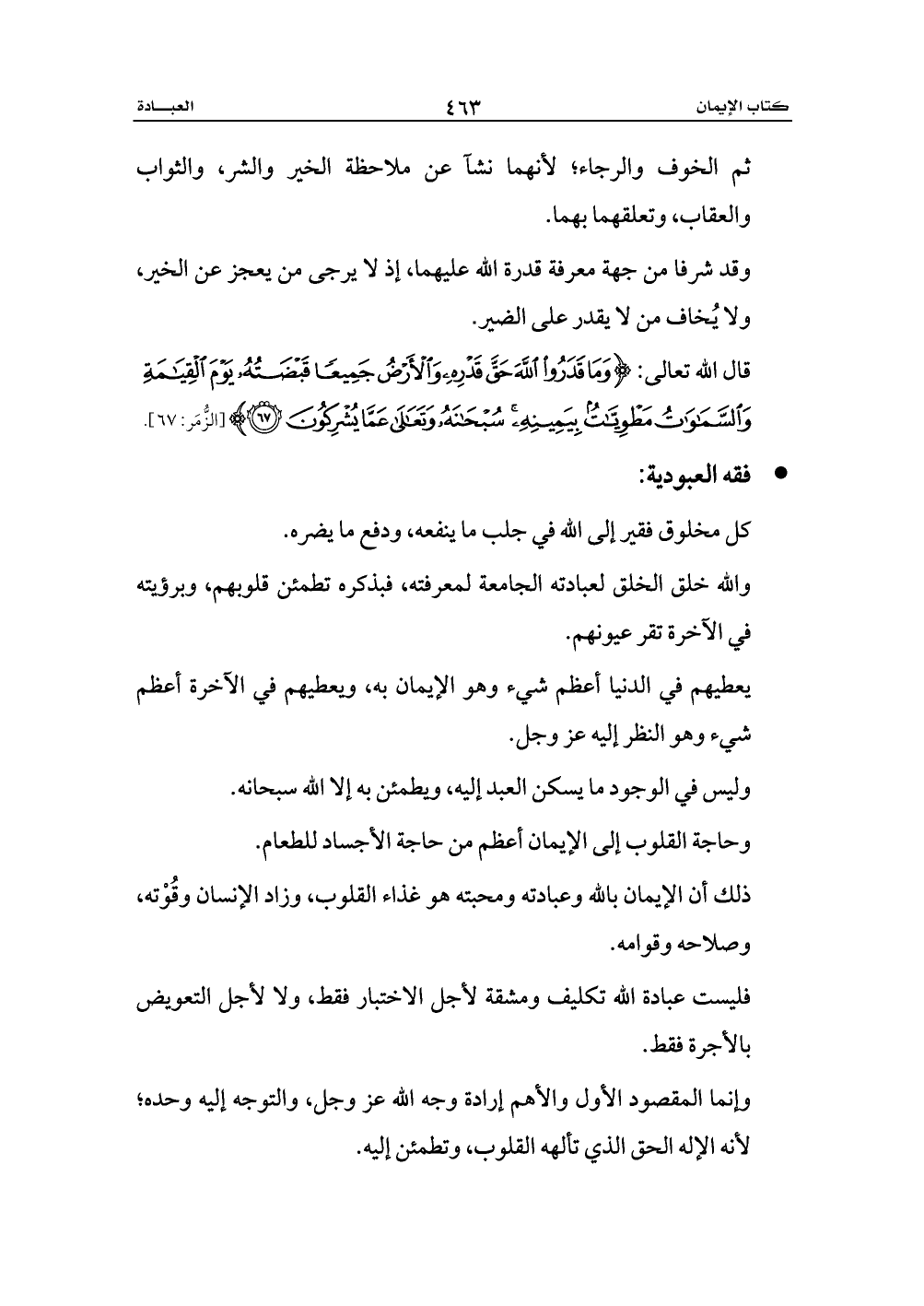 ذلك أن الإيمان بالله وعبادته ومحبته هو غذاء القلوب، وزاد الإنسان وقُوْته، وصلاحه وقوامه.