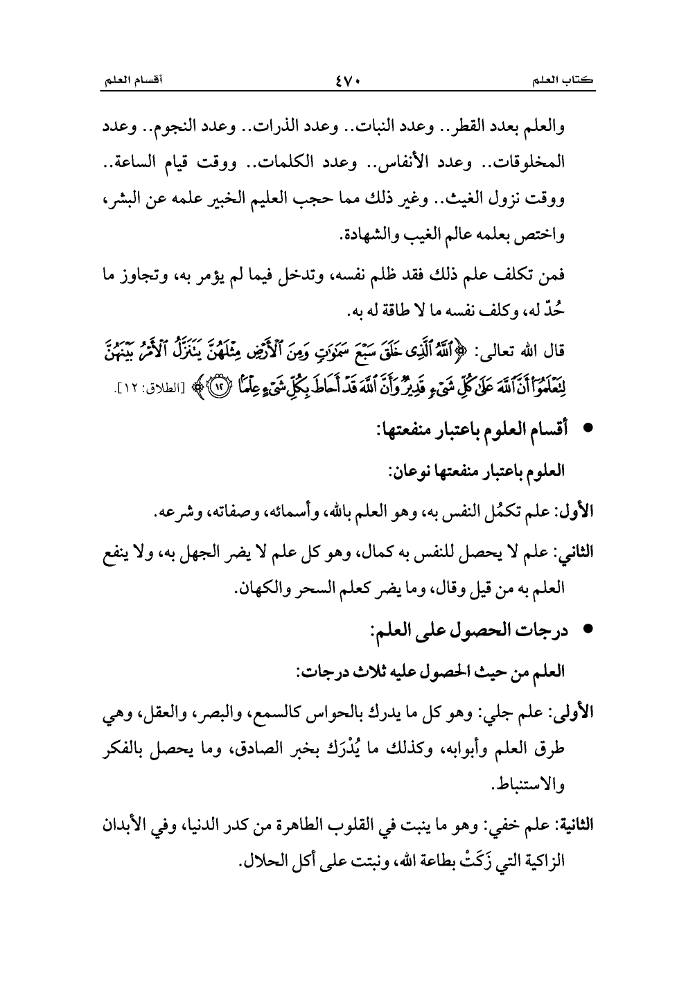 الثاني: علم لا يحصل للنفس به كمال، وهو كل علم لا يضر الجهل به، ولا ينفع العلم به من قيل وقال، وما يضر كعلم السحر والكهان.