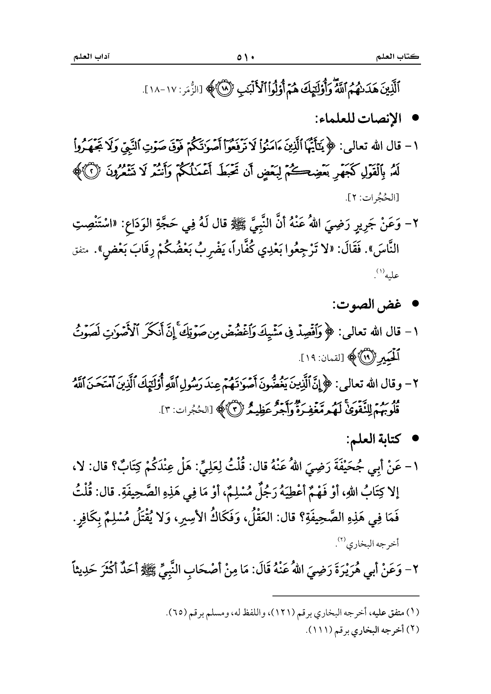 2 - وَعَنْ جَرِيرٍ رَضِيَ اللهُ عَنْهُ أنَّ النَّبِيَّ - صلى الله عليه وسلم - قال لَهُ فِي حَجَّةِ الوَدَاعِ: «اسْتَنْصِتِ النَّاسَ». فَقَالَ: «لا تَرْجِعُوا بَعْدِي كُفَّاراً، يَضْرِبُ بَعْضُكُمْ رِقَابَ بَعْضٍ». متفق عليه (¬1).