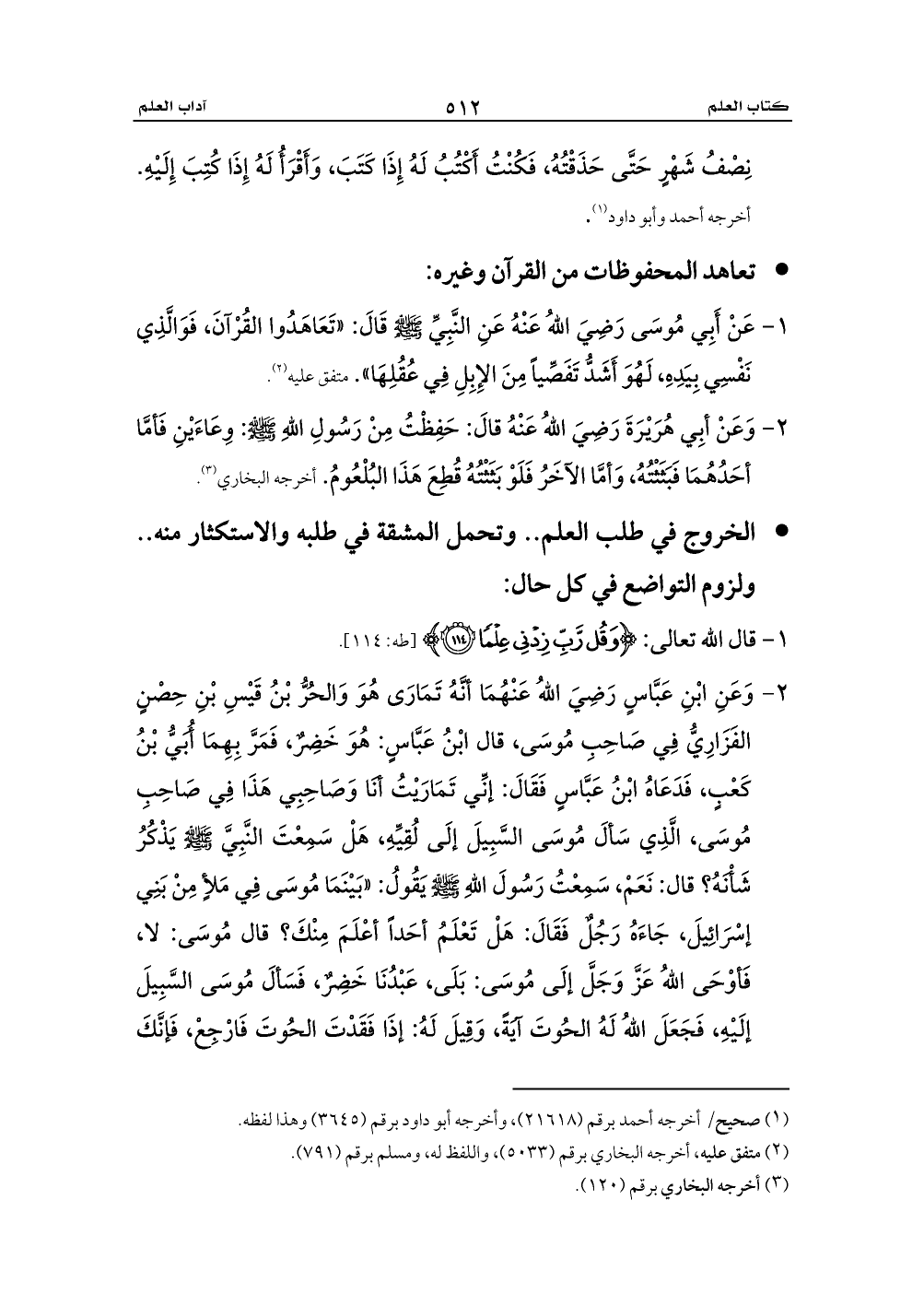 - الخروج في طلب العلم .. وتحمل المشقة في طلبه والاستكثار منه .. ولزوم التواضع في كل حال: