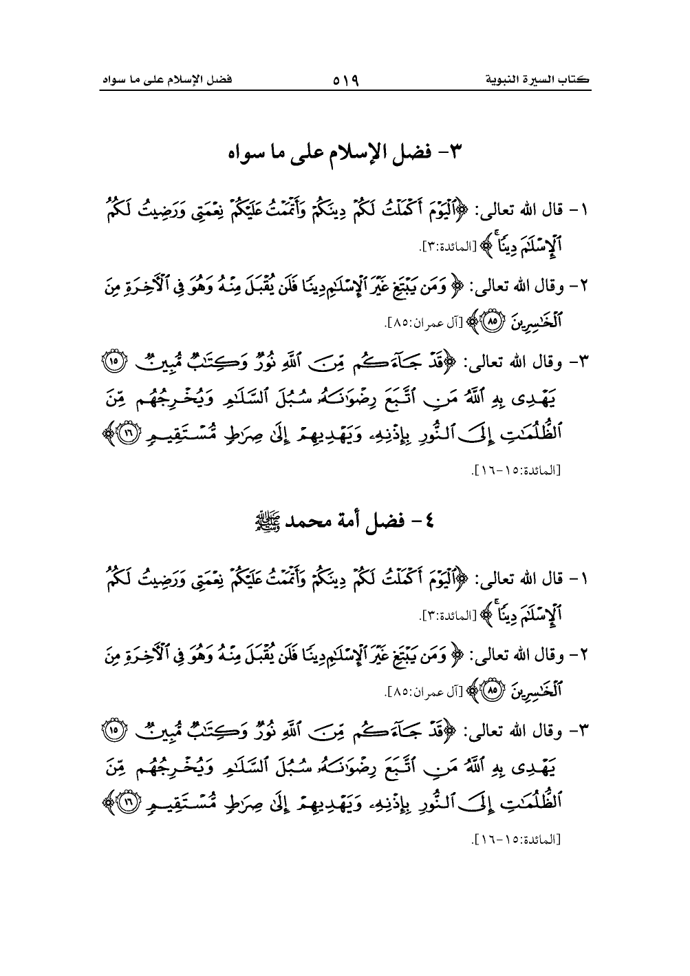3 - وقال الله تعالى: {قَدْ جَاءَكُمْ مِنَ اللَّهِ نُورٌ وَكِتَابٌ مُبِينٌ (15) يَهْدِي بِهِ اللَّهُ مَنِ اتَّبَعَ رِضْوَانَهُ سُبُلَ السَّلَامِ وَيُخْرِجُهُمْ مِنَ الظُّلُمَاتِ إِلَى النُّورِ بِإِذْنِهِ وَيَهْدِيهِمْ إِلَى صِرَاطٍ مُسْتَقِيمٍ (16)} [المائدة:15 - 16].