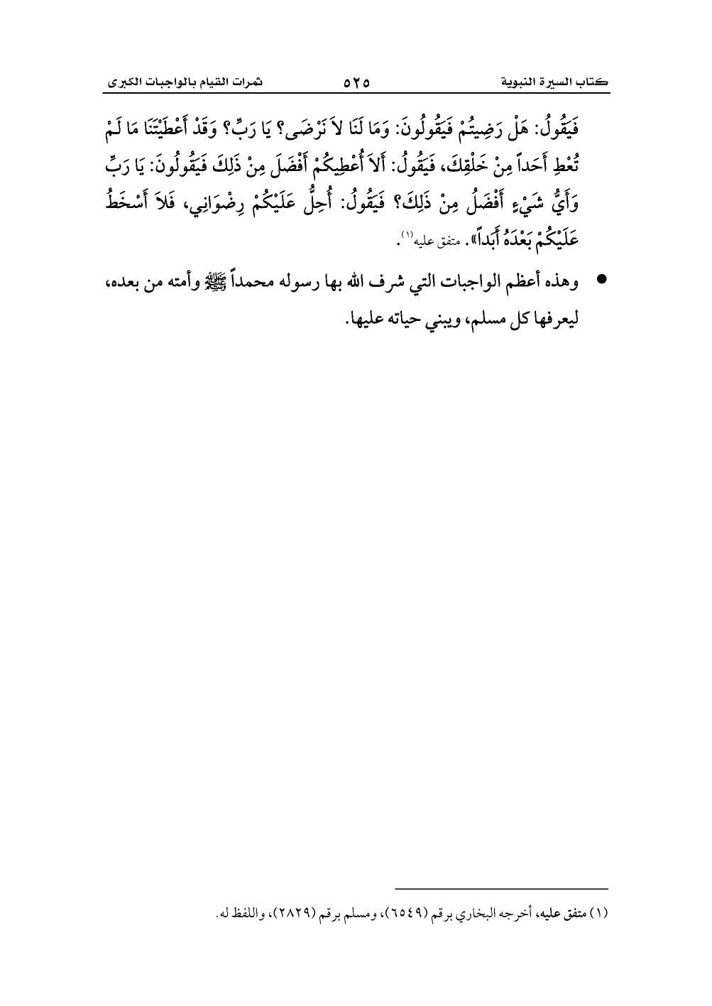 فَيَقُولُ: هَلْ رَضِيتُمْ فَيَقُولُونَ: وَمَا لَنَا لاَ نَرْضَى؟ يَا رَبِّ؟ وَقَدْ أَعْطَيْتَنَا مَا لَمْ تُعْطِ أَحَداً مِنْ خَلْقِكَ، فَيَقُولُ: أَلاَ أُعْطِيكُمْ أَفْضَلَ مِنْ ذَلِكَ فَيَقُولُونَ: يَا رَبِّ وَأَيُّ شَيْءٍ أَفْضَلُ مِنْ ذَلِكَ؟ فَيَقُولُ: أُحِلُّ عَلَيْكُمْ رِضْوَانِي، فَلاَ أَسْخَطُ عَلَيْكُمْ بَعْدَهُ أَبَداً». متفق عليه (¬1).