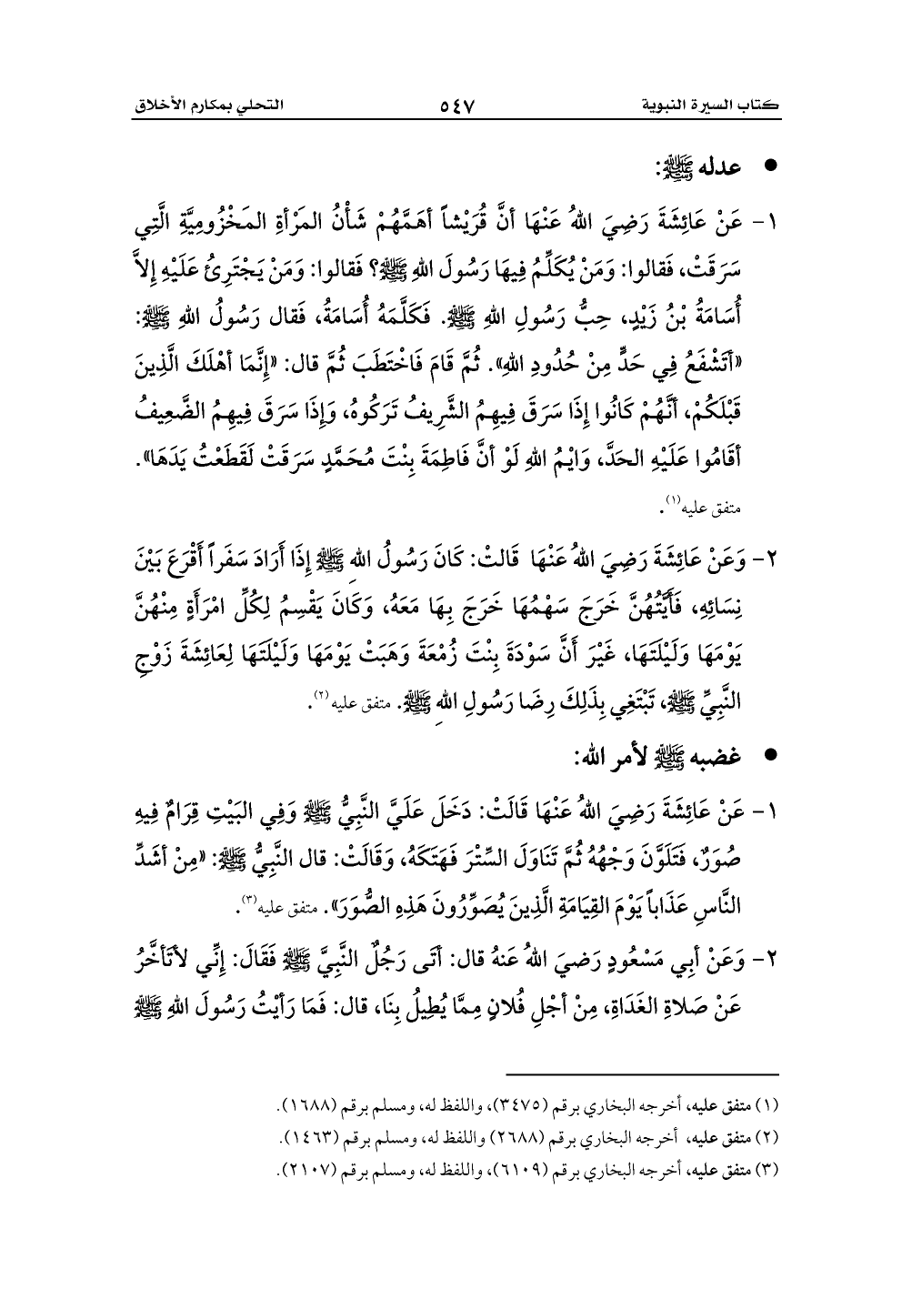 1 - عَنْ عَائِشَةَ رَضِيَ اللهُ عَنْهَا أنَّ قُرَيْشاً أهَمَّهُمْ شَأْنُ المَرْأةِ المَخْزُومِيَّةِ الَّتِي سَرَقَتْ، فَقالوا: وَمَنْ يُكَلِّمُ فِيهَا رَسُولَ اللهِ - صلى الله عليه وسلم -؟ فَقالوا: وَمَنْ يَجْتَرِئُ عَلَيْهِ إِلاَّ أُسَامَةُ بْنُ زَيْدٍ، حِبُّ رَسُولِ اللهِ - صلى الله عليه وسلم -. فَكَلَّمَهُ أُسَامَةُ، فَقال رَسُولُ اللهِ - صلى الله عليه وسلم -: «أتَشْفَعُ فِي حَدٍّ مِنْ حُدُودِ اللهِ». ثُمَّ قَامَ فَاخْتَطَبَ ثُمَّ قال: «إِنَّمَا أهْلَكَ الَّذِينَ قَبْلَكُمْ، أنَّهُمْ كَانُوا إِذَا سَرَقَ فِيهِمُ الشَّرِيفُ تَرَكُوهُ، وَإِذَا سَرَقَ فِيهِمُ الضَّعِيفُ أقَامُوا عَلَيْهِ الحَدَّ، وَايْمُ اللهِ لَوْ أنَّ فَاطِمَةَ بِنْتَ مُحَمَّدٍ سَرَقَتْ لَقَطَعْتُ يَدَهَا». متفق عليه (¬1).