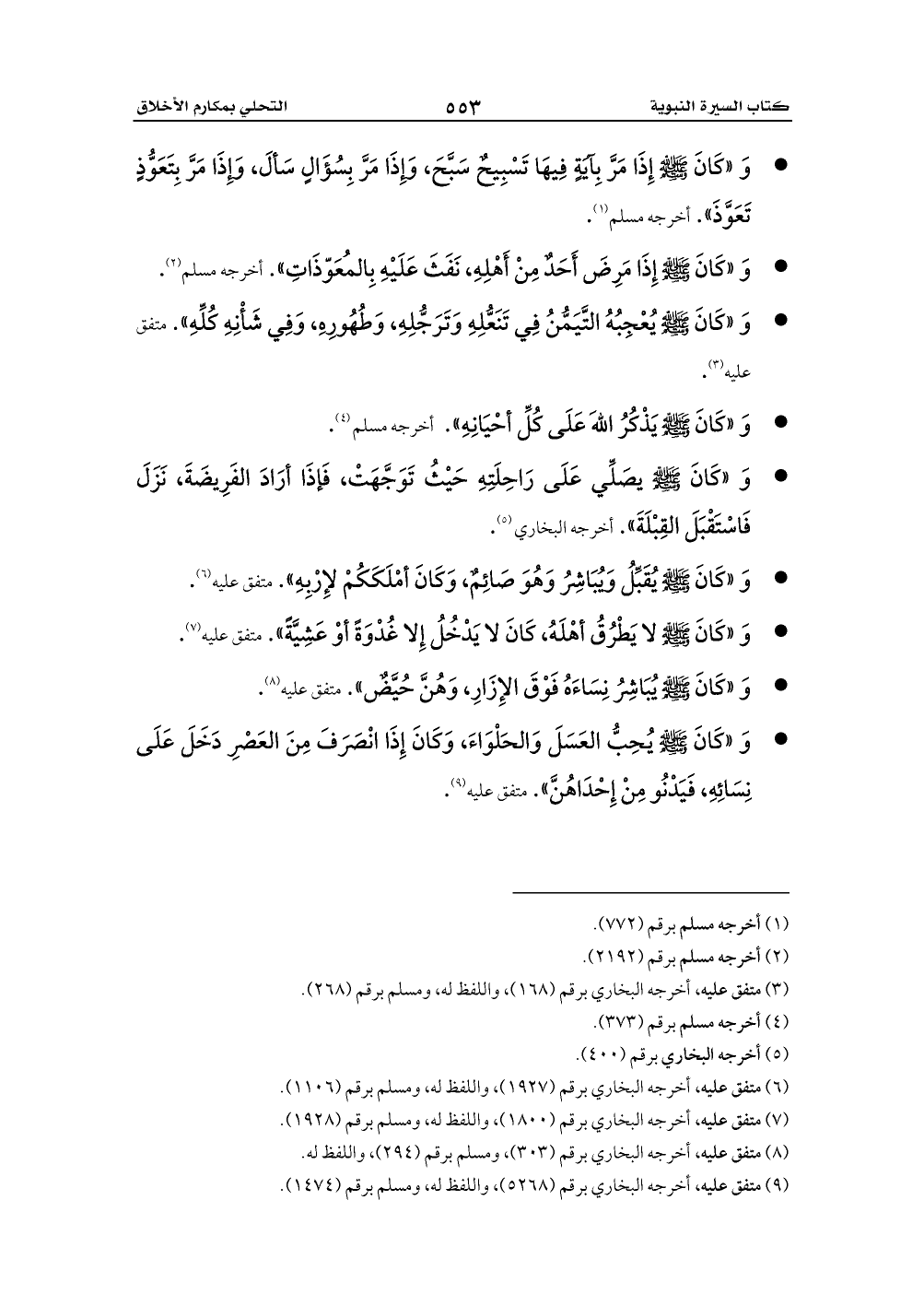 - وَ «كَانَ - صلى الله عليه وسلم - يُحِبُّ العَسَلَ وَالحَلْوَاءَ، وَكَانَ إِذَا انْصَرَفَ مِنَ العَصْرِ دَخَلَ عَلَى نِسَائِهِ، فَيَدْنُو مِنْ إِحْدَاهُنَّ». متفق عليه (¬9).