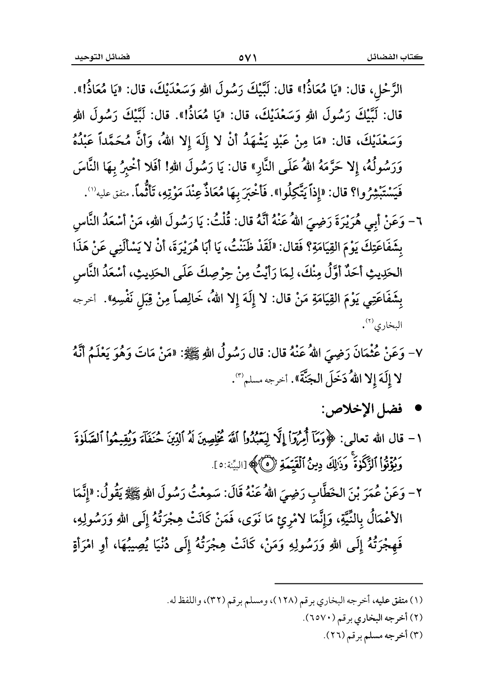 الرَّحْلِ، قال: «يَا مُعَاذُ!» قال: لَبَّيْكَ رَسُولَ اللهِ وَسَعْدَيْكَ، قال: «يَا مُعَاذُ!». قال: لَبَّيْكَ رَسُولَ اللهِ وَسَعْدَيْكَ، قال: «يَا مُعَاذُ!». قال: لَبَّيْكَ رَسُولَ اللهِ وَسَعْدَيْكَ، قال: «مَا مِنْ عَبْدٍ يَشْهَدُ أنْ لا إِلَهَ إِلا اللهُ، وَأنَّ مُحَمَّداً عَبْدُهُ وَرَسُولُهُ، إِلا حَرَّمَهُ اللهُ عَلَى النَّارِ» قال: يَا رَسُولَ اللهِ! أفَلا أخْبِرُ بِهَا النَّاسَ فَيَسْتَبْشِرُوا؟ قال: «إِذاً يَتَّكِلُوا». فَأخْبَرَ بِهَا مُعَاذٌ عِنْدَ مَوْتِهِ، تَأثُّماً. متفق عليه (¬1).