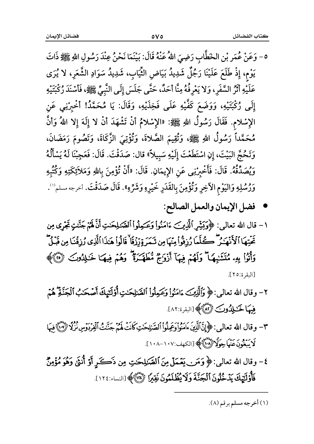 5 - وَعَنْ عُمَر بْن الخَطَّابِ رَضِيَ اللهُ عَنْهُ قَالَ: بَيْنَمَا نَحْنُ عِنْدَ رَسُولِ اللهِ - صلى الله عليه وسلم - ذَاتَ يَوْمٍ، إِذْ طَلَعَ عَلَيْنَا رَجُلٌ شَدِيدُ بَيَاضِ الثِّيَابِ، شَدِيدُ سَوَادِ الشَّعَرِ، لا يُرَى عَلَيْهِ أثَرُ السَّفَرِ، وَلا يَعْرِفُهُ مِنَّا أحَدٌ، حَتَّى جَلَسَ إِلَى النَّبِيِّ - صلى الله عليه وسلم -، فَأسْنَدَ رُكْبَتَيْهِ إِلَى رُكْبَتَيْهِ، وَوَضَعَ كَفَّيْهِ عَلَى فَخِذَيْهِ، وَقَالَ: يَا مُحَمَّدُ! أخْبِرْنِي عَنِ الإِسْلامِ. فَقَالَ رَسُولُ اللهِ - صلى الله عليه وسلم -: «الإِسْلامُ أنْ تَشْهَدَ أنْ لا إِلَهَ إِلا اللهُ وَأنَّ مُحَمَّداً رَسُولُ اللهِ - صلى الله عليه وسلم -، وَتُقِيمَ الصَّلاةَ، وَتُؤْتِيَ الزَّكَاةَ، وَتَصُومَ رَمَضَانَ، وَتَحُجَّ البَيْتَ، إِنِ اسْتَطَعْتَ إِلَيْهِ سَبِيلاً» قال: صَدَقْتَ. قَالَ: فَعَجِبْنَا لَهُ يَسْأَلُهُ وَيُصَدِّقُهُ. قَالَ: فَأَخْبِرْنِى عَنِ الإِيمَانِ. قَالَ: «أَنْ تُؤْمِنَ بِاللهِ وَمَلاَئِكَتِهِ وَكُتُبِهِ وَرُسُلِهِ وَاليَوْمِ الآخِرِ وَتُؤْمِنَ بِالقَدَرِ خَيْرِهِ وَشَرِّهِ». قَالَ صَدَقْتَ. أخرجه مسلم (¬1).