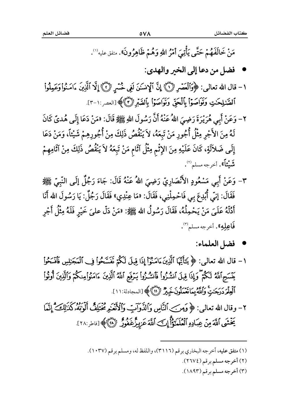 2 - وَعَنْ أَبِي هُرَيْرَةَ رَضِيَ اللهُ عَنْهُ أَنَّ رَسُولَ اللهِ - صلى الله عليه وسلم - قَالَ: «مَنْ دَعَا إِلَى هُدىً كَانَ لَهُ مِنَ الأَجْرِ مِثْلُ أُجُورِ مَنْ تَبِعَهُ، لاَ يَنْقُصُ ذَلِكَ مِنْ أُجُورِهِمْ شَيْئاً، وَمَنْ دَعَا إِلَى ضَلاَلَةٍ، كَانَ عَلَيْهِ مِنَ الإِثْمِ مِثْلُ آثَامِ مَنْ تَبِعَهُ لاَ يَنْقُصُ ذَلِكَ مِنْ آثَامِهِمْ شَيْئاً». أخرجه مسلم (¬2).