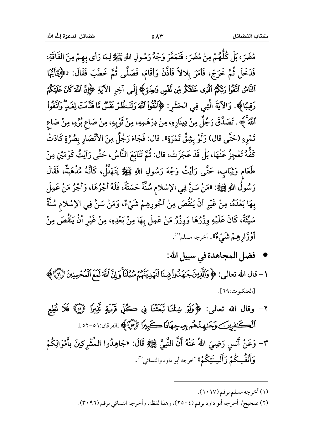 مُضَرَ، بَلْ كُلُّهُمْ مِنْ مُضَرَ، فَتَمَعَّرَ وَجْهُ رَسُولِ اللهِ - صلى الله عليه وسلم - لِمَا رَأى بِهِمْ مِنَ الفَاقَةِ، فَدَخَلَ ثُمَّ خَرَجَ، فَأمَرَ بِلالاً فَأذَّنَ وَأقَامَ، فَصَلَّى ثُمَّ خَطَبَ فَقَالَ: «{يَاأَيُّهَا النَّاسُ اتَّقُوا رَبَّكُمُ الَّذِي خَلَقَكُمْ مِنْ نَفْسٍ وَاحِدَةٍ} إِلَى آخِرِ الآيَةِ {إِنَّ اللَّهَ كَانَ عَلَيْكُمْ رَقِيبًا}. وَالآيَةَ الَّتِي فِي الحَشْرِ: {اتَّقُوا اللَّهَ وَلْتَنْظُرْ نَفْسٌ مَا قَدَّمَتْ لِغَدٍ وَاتَّقُوا اللَّهَ}. تَصَدَّقَ رَجُلٌ مِنْ دِينَارِهِ، مِنْ دِرْهَمِهِ، مِنْ ثَوْبِهِ، مِنْ صَاعِ بُرِّهِ، مِنْ صَاعِ تَمْرِهِ (حَتَّى قال) وَلَوْ بِشِقِّ تَمْرَةٍ». قال: فَجَاءَ رَجُلٌ مِنَ الأنْصَارِ بِصُرَّةٍ كَادَتْ كَفُّهُ تَعْجِزُ عَنْهَا، بَلْ قَدْ عَجَزَتْ، قال: ثُمَّ تَتَابَعَ النَّاسُ، حَتَّى رَأيْتُ كَوْمَيْنِ مِنْ طَعَامٍ وَثِيَابٍ، حَتَّى رَأيْتُ وَجْهَ رَسُولِ اللهِ - صلى الله عليه وسلم - يَتَهَلَّلُ، كَأنَّهُ مُذْهَبَةٌ، فَقَالَ رَسُولُ اللهِ - صلى الله عليه وسلم -: «مَنْ سَنَّ فِي الإسْلامِ سُنَّةً حَسَنَةً، فَلَهُ أجْرُهَا، وَأجْرُ مَنْ عَمِلَ بِهَا بَعْدَهُ، مِنْ غَيْرِ أنْ يَنْقُصَ مِنْ أجُورِهِمْ شَيْءٌ، وَمَنْ سَنَّ فِي الإسْلامِ سُنَّةً سَيِّئَةً، كَانَ عَلَيْهِ وِزْرُهَا وَوِزْرُ مَنْ عَمِلَ بِهَا مِنْ بَعْدِهِ، مِنْ غَيْرِ أنْ يَنْقُصَ مِنْ أوْزَارِهِمْ شَيْءٌ». أخرجه مسلم (¬1).