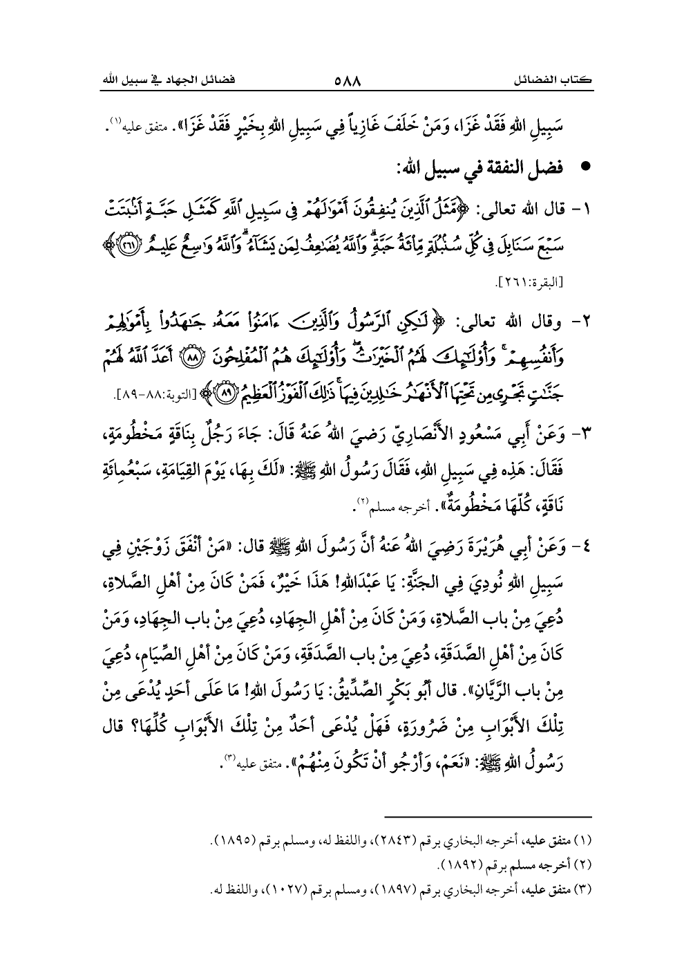 2 - وقال الله تعالى: {لَكِنِ الرَّسُولُ وَالَّذِينَ آمَنُوا مَعَهُ جَاهَدُوا بِأَمْوَالِهِمْ وَأَنْفُسِهِمْ وَأُولَئِكَ لَهُمُ الْخَيْرَاتُ وَأُولَئِكَ هُمُ الْمُفْلِحُونَ (88) أَعَدَّ اللَّهُ لَهُمْ جَنَّاتٍ تَجْرِي مِنْ تَحْتِهَا الْأَنْهَارُ خَالِدِينَ فِيهَا ذَلِكَ الْفَوْزُ الْعَظِيمُ (89)} [التوبة:88 - 89].