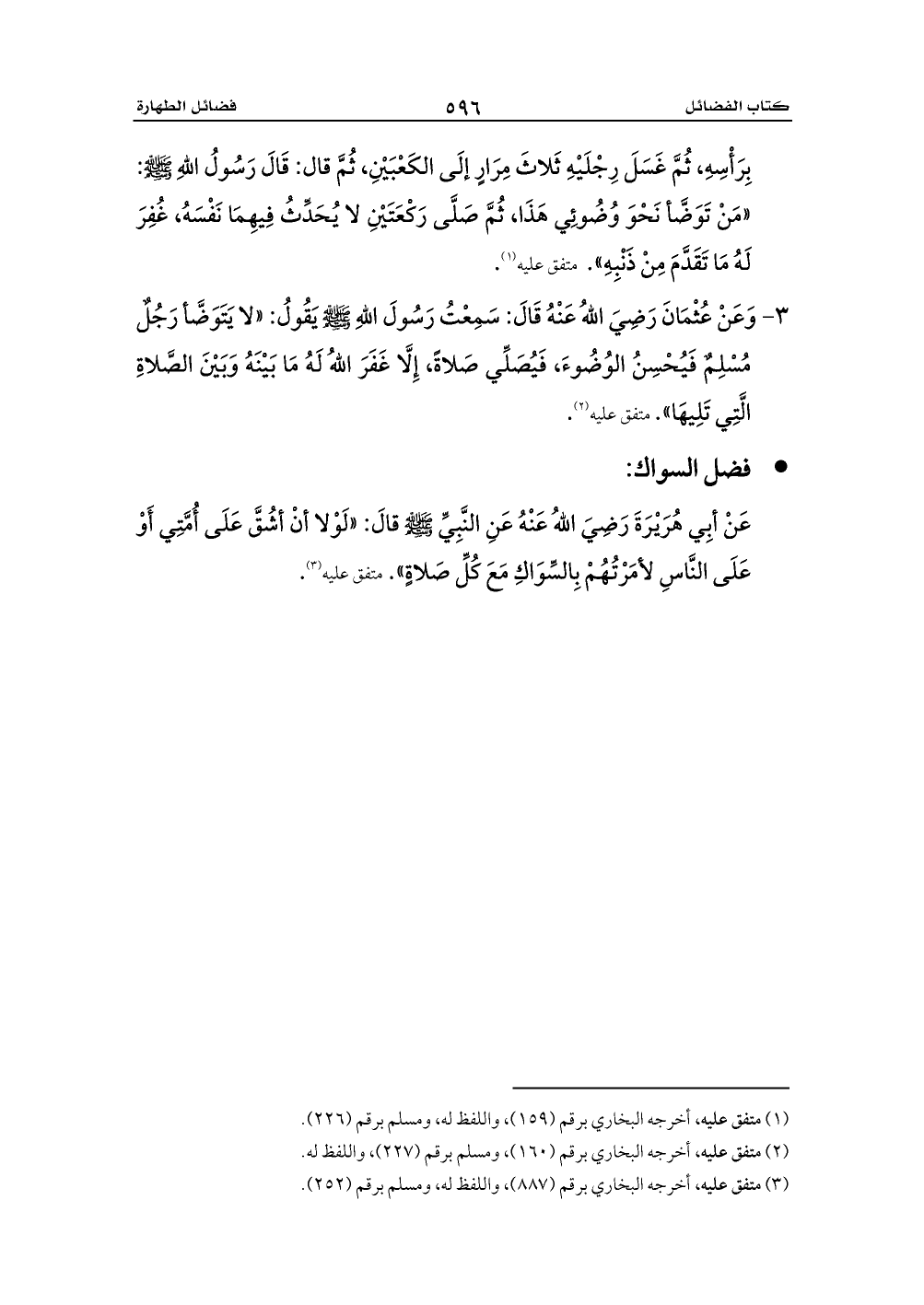 بِرَأْسِهِ، ثُمَّ غَسَلَ رِجْلَيْهِ ثَلاثَ مِرَارٍ إلَى الكَعْبَيْنِ، ثُمَّ قال: قَالَ رَسُولُ اللهِ - صلى الله عليه وسلم -: «مَنْ تَوَضَّأ نَحْوَ وُضُوئِي هَذَا، ثُمَّ صَلَّى رَكْعَتَيْنِ لا يُحَدِّثُ فِيهِمَا نَفْسَهُ، غُفِرَ لَهُ مَا تَقَدَّمَ مِنْ ذَنْبِهِ». متفق عليه (¬1).
