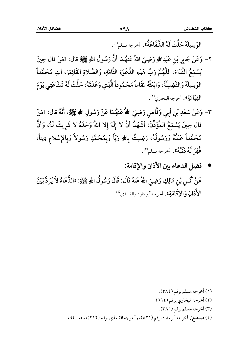 3 - وَعَنْ سَعْدِ بْنِ أبِي وَقَّاصٍ رَضِيَ اللهُ عَنهُمَا عَنْ رَسُولِ اللهِ - صلى الله عليه وسلم -، أنَّهُ قال: «مَنْ قال حِينَ يَسْمَعُ المُؤَذِّنَ: أشْهَدُ أنْ لا إِلَهَ إِلا اللهُ وَحْدَهُ لا شَرِيكَ لَهُ، وَأنَّ مُحَمَّداً عَبْدُهُ وَرَسُولُهُ، رَضِيتُ بِاللهِ رَبّاً وَبِمُحَمَّدٍ رَسُولاً وَبِالإِسْلامِ دِيناً، غُفِرَ لَهُ ذَنْبُهُ». أخرجه مسلم (¬3).