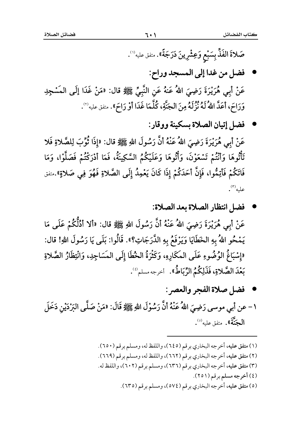 عَنْ أبِي هُرَيْرَةَ رَضِيَ اللهُ عَنهُ عَنِ النَّبِيِّ - صلى الله عليه وسلم - قال: «مَنْ غَدَا إلَى المَسْجِدِ وَرَاحَ، أعَدَّ اللهُ لَهُ نُزُلَهُ مِنَ الجَنَّةِ، كُلَّمَا غَدَا أوْ رَاحَ». متفق عليه (¬2).