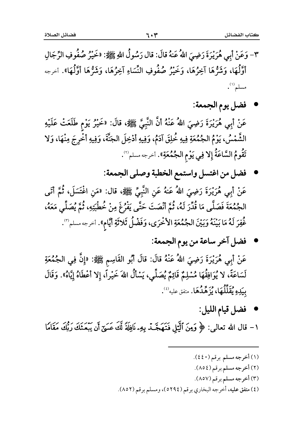 3 - وَعَنْ أبِي هُرَيْرَةَ رَضِيَ اللهُ عَنهُ قالَ: قال رَسُولُ اللهِ - صلى الله عليه وسلم -: «خَيْرُ صُفُوفِ الرِّجَالِ أوَّلُهَا، وَشَرُّهَا آخِرُهَا، وَخَيْرُ صُفُوفِ النِّسَاءِ آخِرُهَا، وَشَرُّهَا أوَّلُهَا». أخرجه مسلم (¬1).