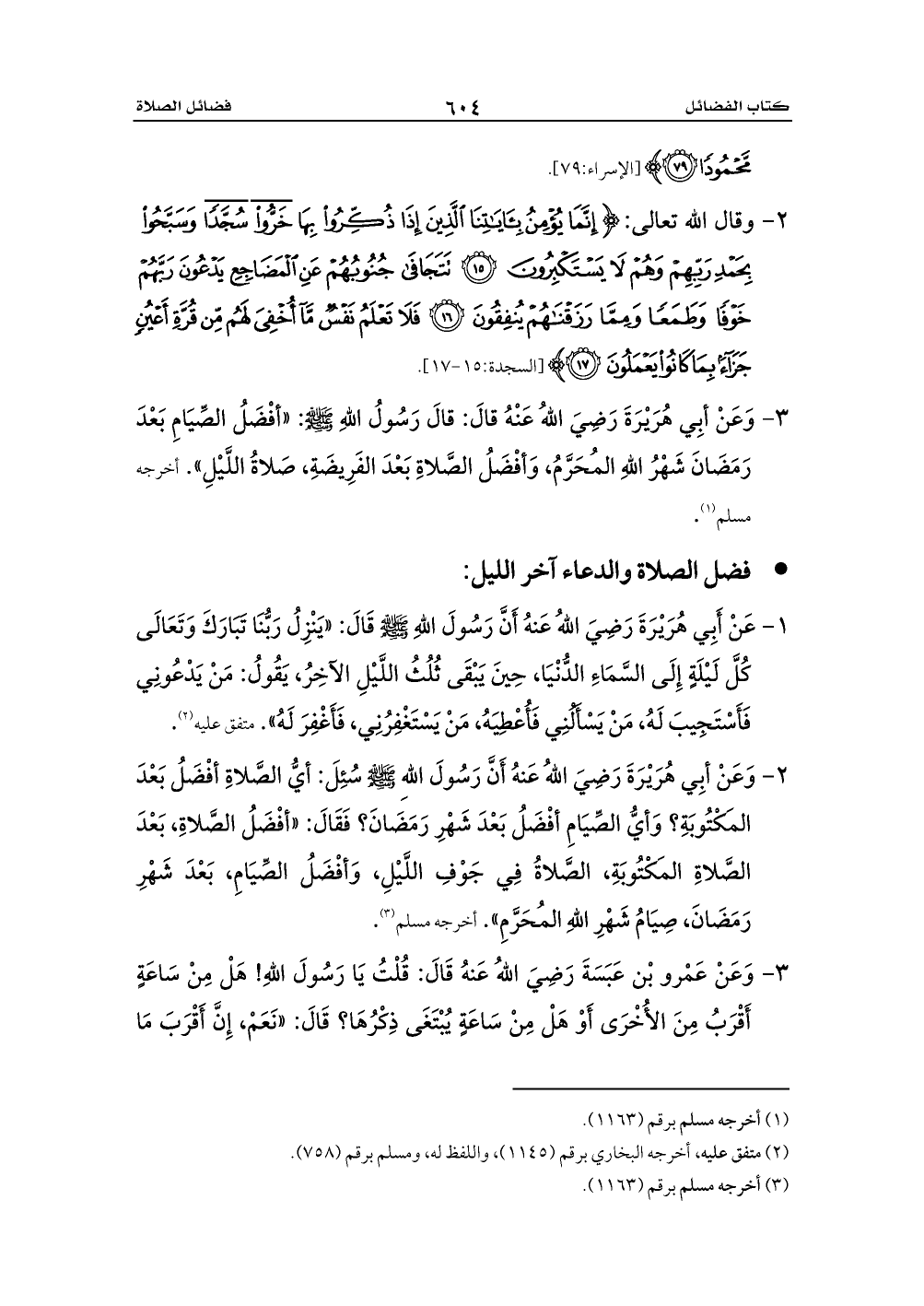 3 - وَعَنْ أبِي هُرَيْرَةَ رَضِيَ اللهُ عَنْهُ قالَ: قالَ رَسُولُ اللهِ - صلى الله عليه وسلم -: «أفْضَلُ الصِّيَامِ بَعْدَ رَمَضَانَ شَهْرُ اللهِ المُحَرَّمُ، وَأفْضَلُ الصَّلاةِ بَعْدَ الفَرِيضَةِ، صَلاةُ اللَّيْلِ». أخرجه مسلم (¬1).