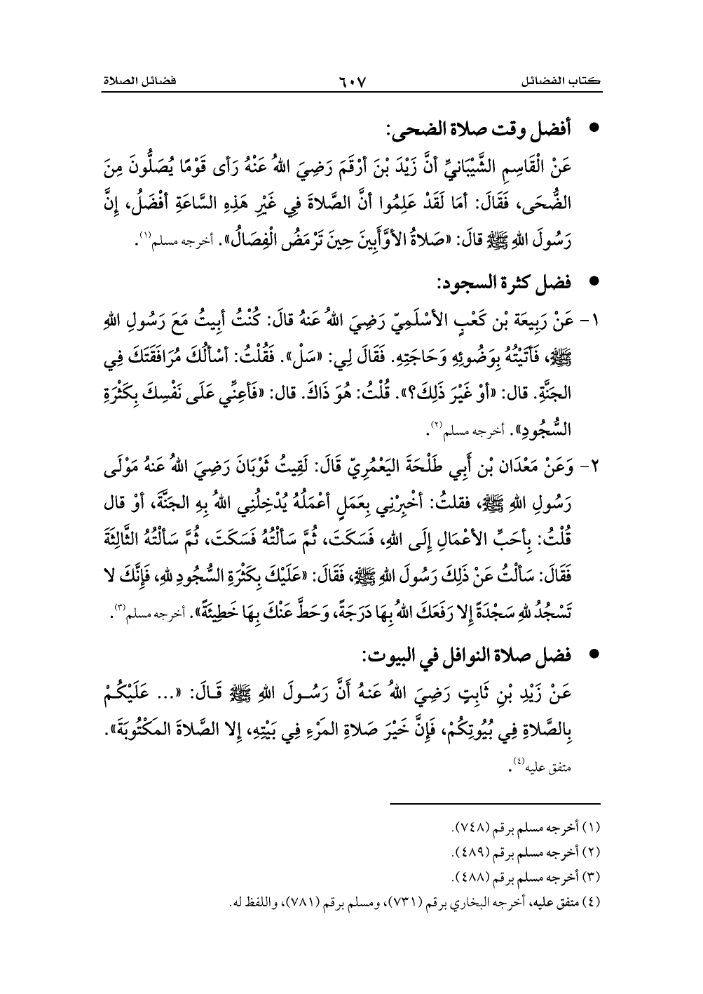 1 - عَنْ رَبِيعَة بْن كَعْبٍ الأسْلَمِيّ رَضِيَ اللهُ عَنهُ قالَ: كُنْتُ أبِيتُ مَعَ رَسُولِ اللهِ - صلى الله عليه وسلم -، فَأتَيْتُهُ بِوَضُوئِهِ وَحَاجَتِهِ. فَقَالَ لِي: «سَلْ». فَقُلْتُ: أسْألُكَ مُرَافَقَتَكَ فِي الجَنَّةِ. قال: «أوْ غَيْرَ ذَلِكَ؟». قُلْتُ: هُوَ ذَاكَ. قال: «فَأعِنِّي عَلَى نَفْسِكَ بِكَثْرَةِ السُّجُودِ». أخرجه مسلم (¬2).