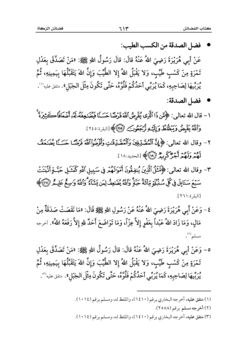 عَنْ أبِي هُرَيْرَةَ رَضِيَ اللهُ عَنْهُ قالَ: قالَ رَسُولُ اللهِ - صلى الله عليه وسلم -: «مَنْ تَصَدَّقَ بِعَدْلِ تَمْرَةٍ مِنْ كَسْبٍ طَيِّبٍ، وَلا يَقْبَلُ اللهُ إِلا الطَّيِّبَ وَإِنَّ اللهَ يَتَقَبَّلُهَا بِيَمِينِهِ، ثُمَّ يُرَبِّيهَا لِصَاحِبِهِ، كَمَا يُرَبِّي أحَدُكُمْ فَلُوَّهُ، حَتَّى تَكُونَ مِثْلَ الجَبَلِ». متفق عليه (¬1).