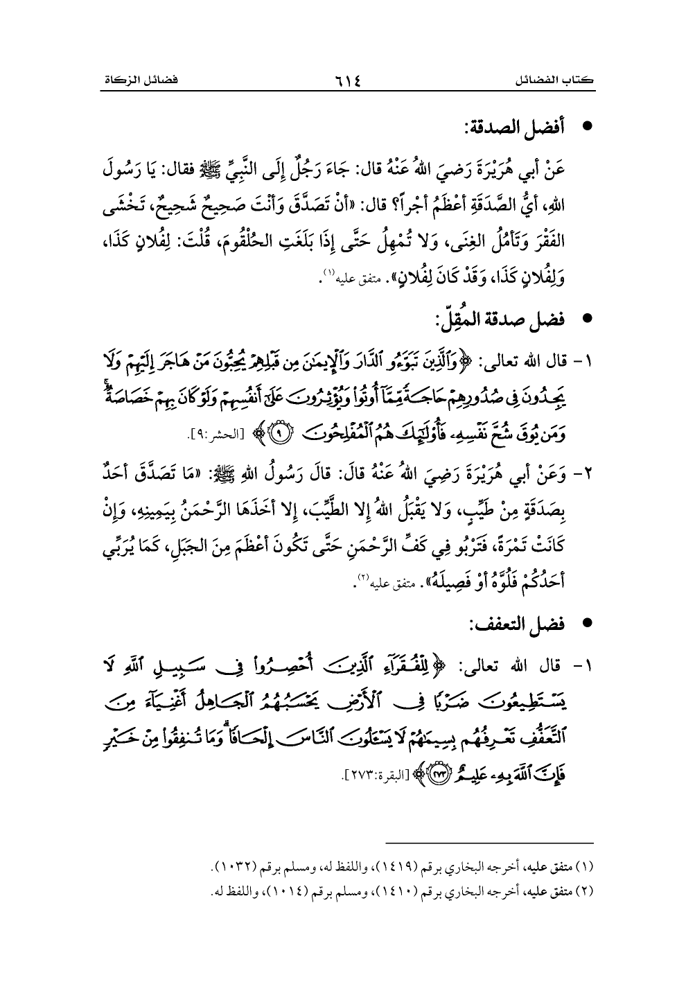 عَنْ أبي هُرَيْرَةَ رَضيَ اللهُ عَنْهُ قال: جَاءَ رَجُلٌ إِلَى النَّبِيِّ - صلى الله عليه وسلم - فقال: يَا رَسُولَ اللهِ، أيُّ الصَّدَقَةِ أعْظَمُ أجْراً؟ قال: «أنْ تَصَدَّقَ وَأنْتَ صَحِيحٌ شَحِيحٌ، تَخْشَى الفَقْرَ وَتَأمُلُ الغِنَى، وَلا تُمْهِلُ حَتَّى إِذَا بَلَغَتِ الحُلْقُومَ، قُلْتَ: لِفُلانٍ كَذَا، وَلِفُلانٍ كَذَا، وَقَدْ كَانَ لِفُلانٍ». متفق عليه (¬1).