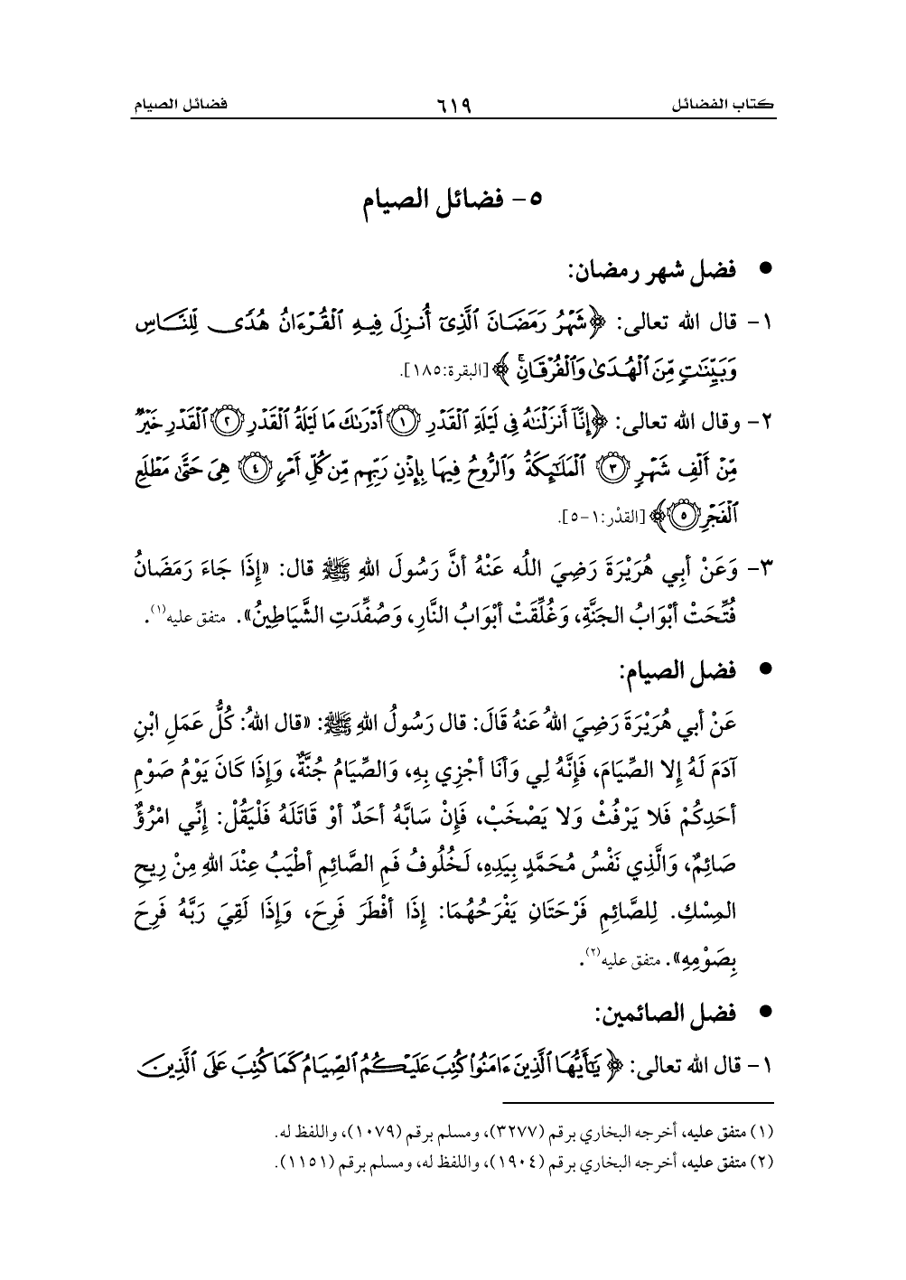 عَنْ أبي هُرَيْرَةَ رَضِيَ اللهُ عَنهُ قَالَ: قال رَسُولُ اللهِ - صلى الله عليه وسلم -: «قال اللهُ: كُلُّ عَمَلِ ابْنِ آدَمَ لَهُ إِلا الصِّيَامَ، فَإِنَّهُ لِي وَأنَا أجْزِي بِهِ، وَالصِّيَامُ جُنَّةٌ، وَإِذَا كَانَ يَوْمُ صَوْمِ أحَدِكُمْ فَلا يَرْفُثْ وَلا يَصْخَبْ، فَإِنْ سَابَّهُ أحَدٌ أوْ قَاتَلَهُ فَلْيَقُلْ: إِنِّي امْرُؤٌ صَائِمٌ، وَالَّذِي نَفْسُ مُحَمَّدٍ بِيَدِهِ، لَخُلُوفُ فَمِ الصَّائِمِ أطْيَبُ عِنْدَ اللهِ مِنْ رِيحِ المِسْكِ. لِلصَّائِمِ فَرْحَتَانِ يَفْرَحُهُمَا: إِذَا أفْطَرَ فَرِحَ، وَإِذَا لَقِيَ رَبَّهُ فَرِحَ بِصَوْمِهِ». متفق عليه (¬2).