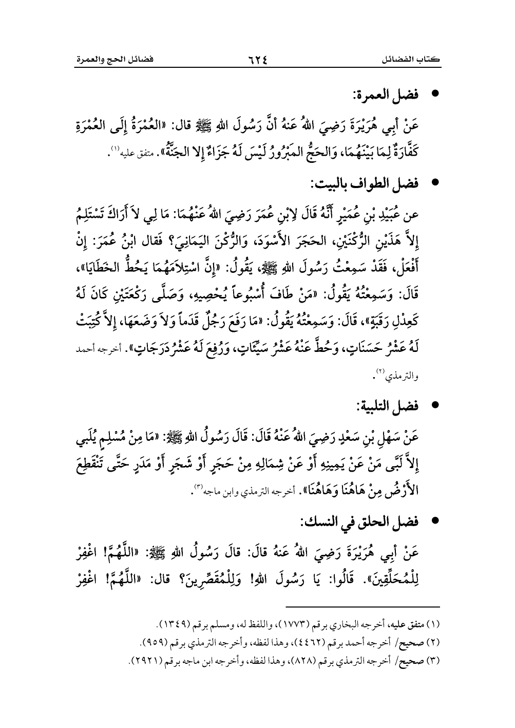 عَنْ أبِي هُرَيْرَةَ رَضِيَ اللهُ عَنهُ أنَّ رَسُولَ اللهِ - صلى الله عليه وسلم - قال: «العُمْرَةُ إِلَى العُمْرَةِ كَفَّارَةٌ لِمَا بَيْنَهُمَا، وَالحَجُّ المَبْرُورُ لَيْسَ لَهُ جَزَاءٌ إِلا الجَنَّةُ». متفق عليه (¬1).