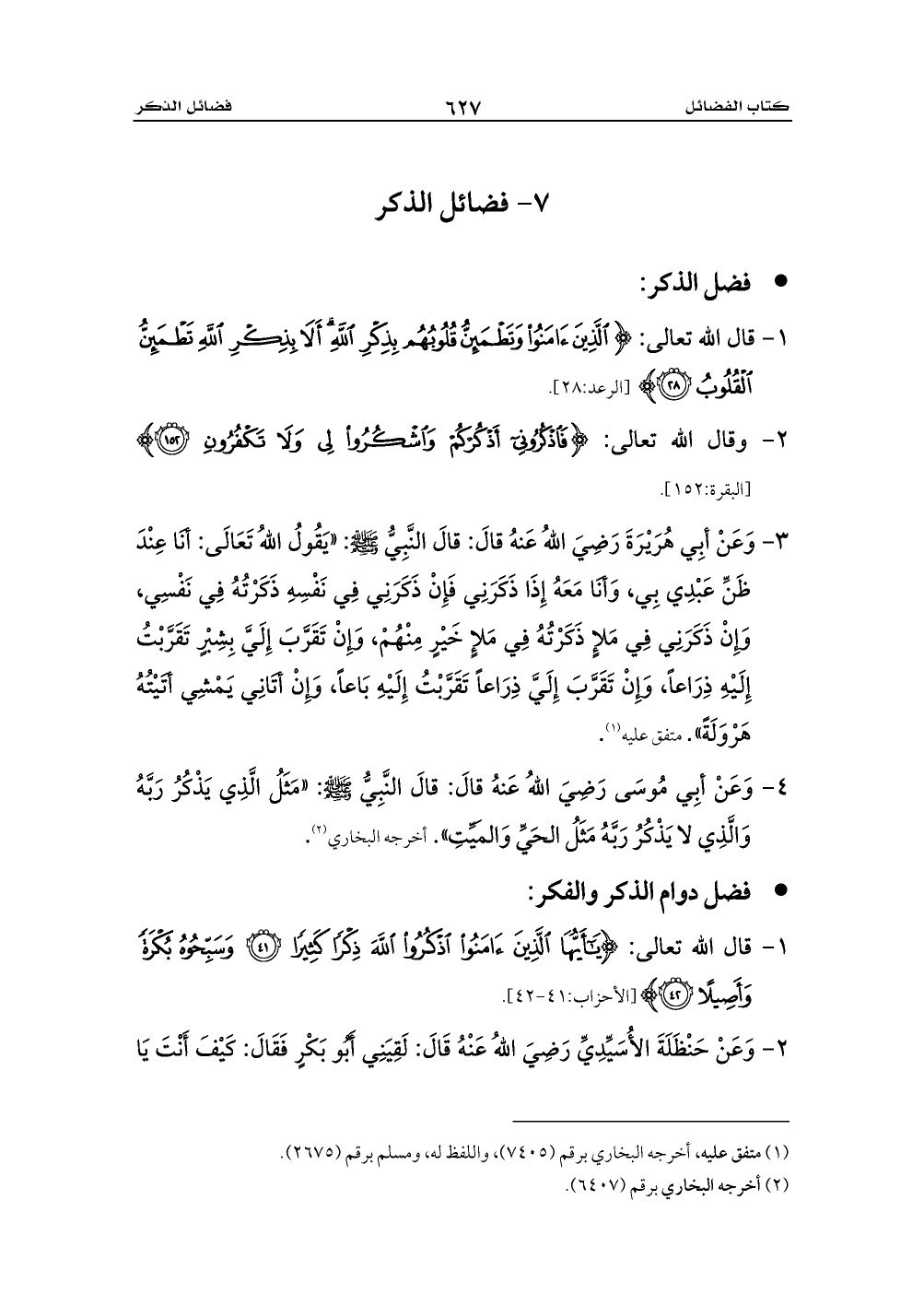 1 - قال الله تعالى: {يَاأَيُّهَا الَّذِينَ آمَنُوا اذْكُرُوا اللَّهَ ذِكْرًا كَثِيرًا (41) وَسَبِّحُوهُ بُكْرَةً وَأَصِيلًا (42)} [الأحزاب:41 - 42].