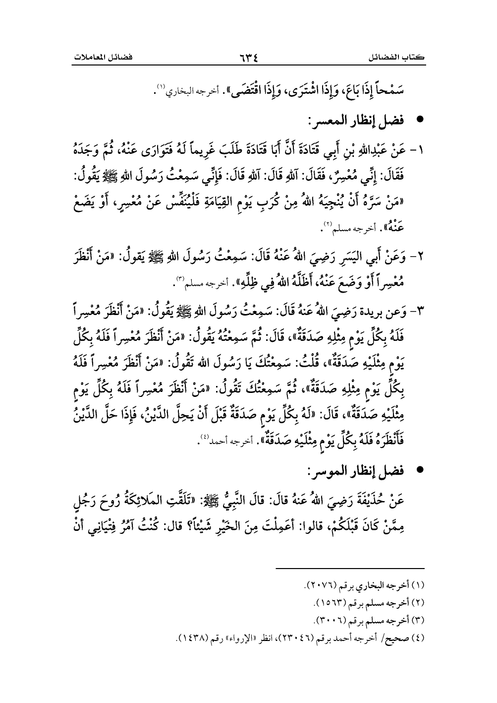1 - عَنْ عَبْدِاللهِ بْنِ أَبِي قَتَادَةَ أَنَّ أَبَا قَتَادَةَ طَلَبَ غَرِيماً لَهُ فَتَوَارَى عَنْهُ، ثُمَّ وَجَدَهُ فَقَالَ: إِنِّي مُعْسِرٌ، فَقَالَ: آللهِ قَالَ: آللهِ قَالَ: فَإِنِّي سَمِعْتُ رَسُولَ اللهِ - صلى الله عليه وسلم - يَقُولُ: «مَنْ سَرَّهُ أَنْ يُنْجِيَهُ اللهُ مِنْ كُرَبِ يَوْمِ القِيَامَةِ فَلْيُنَفِّسْ عَنْ مُعْسِرٍ، أَوْ يَضَعْ عَنْهُ». أخرجه مسلم (¬2).