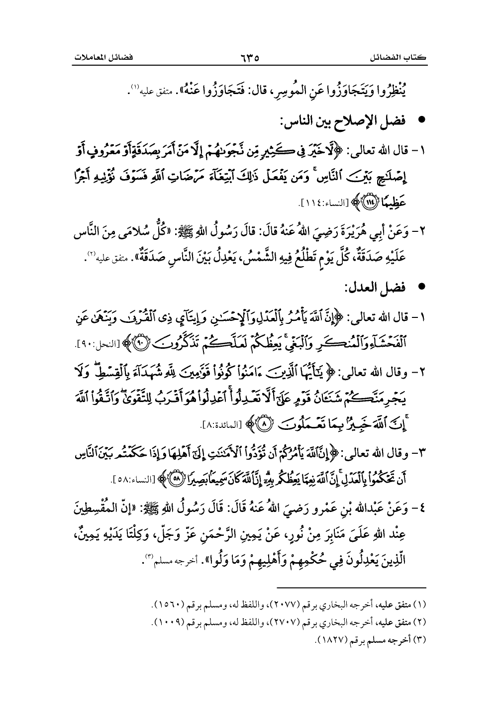 1 - قال الله تعالى: {لَا خَيْرَ فِي كَثِيرٍ مِنْ نَجْوَاهُمْ إِلَّا مَنْ أَمَرَ بِصَدَقَةٍ أَوْ مَعْرُوفٍ أَوْ إِصْلَاحٍ بَيْنَ النَّاسِ وَمَنْ يَفْعَلْ ذَلِكَ ابْتِغَاءَ مَرْضَاتِ اللَّهِ فَسَوْفَ نُؤْتِيهِ أَجْرًا عَظِيمًا (114)} [النساء:114].