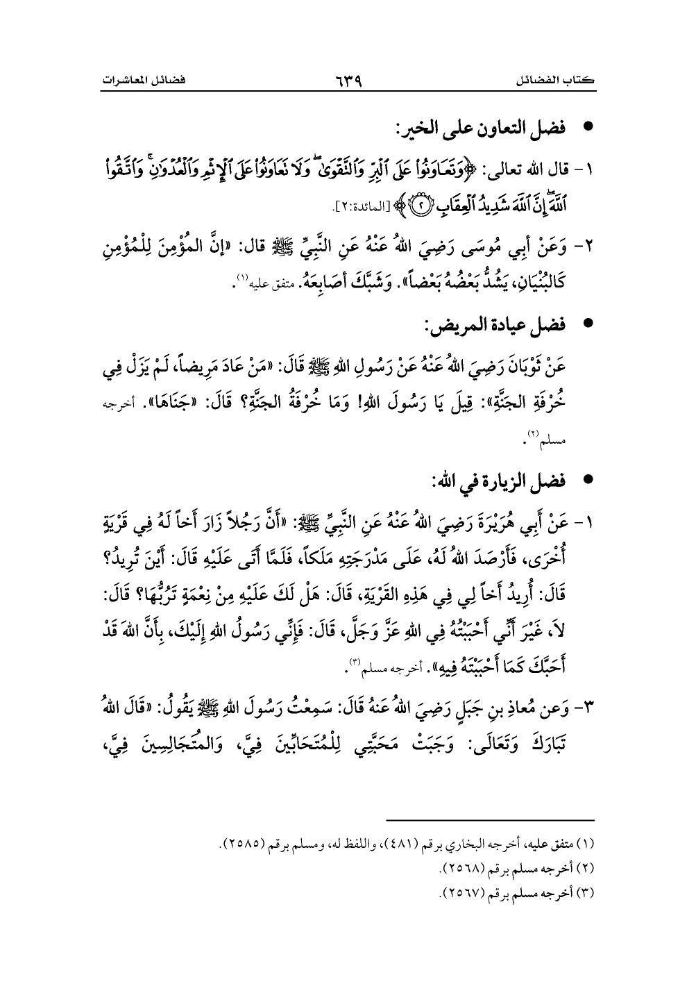 1 - عَنْ أَبِي هُرَيْرَةَ رَضِيَ اللهُ عَنْهُ عَنِ النَّبِيِّ - صلى الله عليه وسلم -: «أَنَّ رَجُلاً زَارَ أَخاً لَهُ فِي قَرْيَةٍ أُخْرَى، فَأَرْصَدَ اللهُ لَهُ، عَلَى مَدْرَجَتِهِ مَلَكاً، فَلَمَّا أَتَى عَلَيْهِ قَالَ: أَيْنَ تُرِيدُ؟ قَالَ: أُرِيدُ أَخاً لِي فِي هَذِهِ القَرْيَةِ، قَالَ: هَلْ لَكَ عَلَيْهِ مِنْ نِعْمَةٍ تَرُبُّهَا؟ قَالَ: لاَ، غَيْرَ أَنِّي أَحْبَبْتُهُ فِي اللهِ عَزَّ وَجَلَّ، قَالَ: فَإِنِّي رَسُولُ اللهِ إِلَيْكَ، بِأَنَّ اللهَ قَدْ أَحَبَّكَ كَمَا أَحْبَبْتَهُ فِيهِ». أخرجه مسلم (¬3).