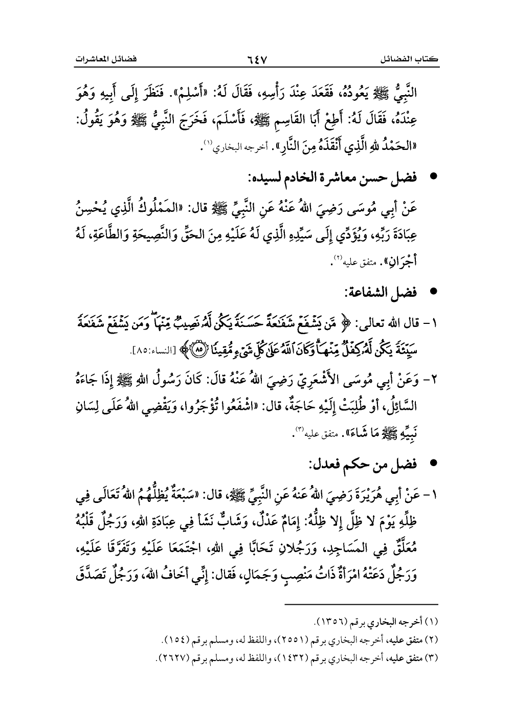 1 - عَنْ أبِي هُرَيْرَةَ رَضِيَ اللهُ عَنهُ عَنِ النَّبِيِّ - صلى الله عليه وسلم -، قال: «سَبْعَةٌ يُظِلُّهُمُ اللهُ تَعَالَى فِي